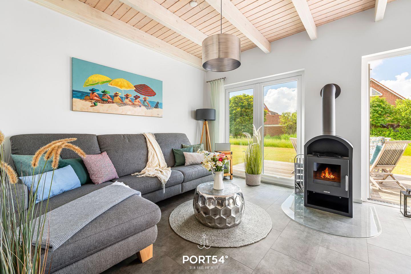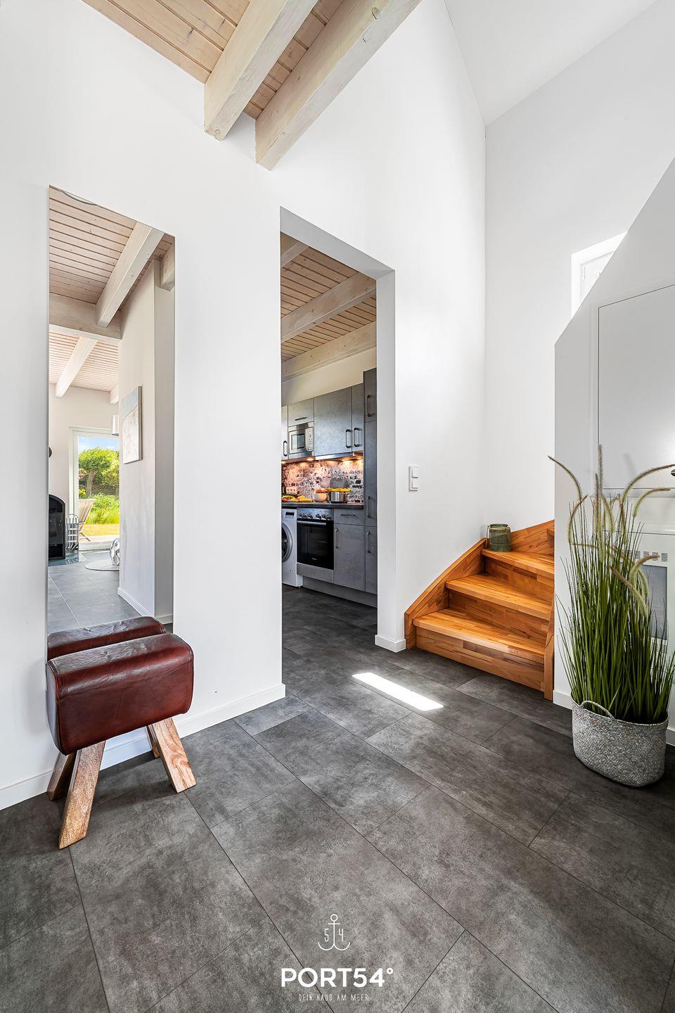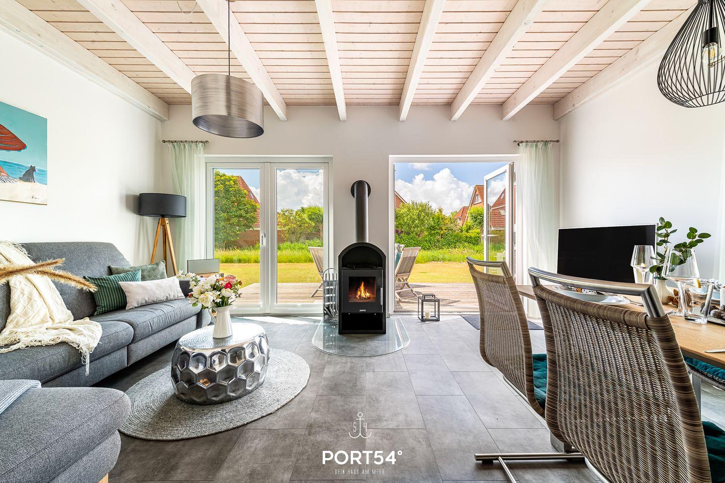 Im Erdgeschoss erwartet dich ein großzügiger Wohn- und Essbereich mit offener Küche, der zum gemeinsamen Kochen, Essen und Verweilen einlädt. Die voll ausgestattete Küche bietet dir alles, was du für einen entspannten Aufenthalt benötigst. Im Wohnbereich kannst du es dir auf dem gemütlichen Sofa bequem machen und vor dem Kamin entspannen – besonders an kühleren Tagen sorgt dieser für eine behagliche Atmosphäre.