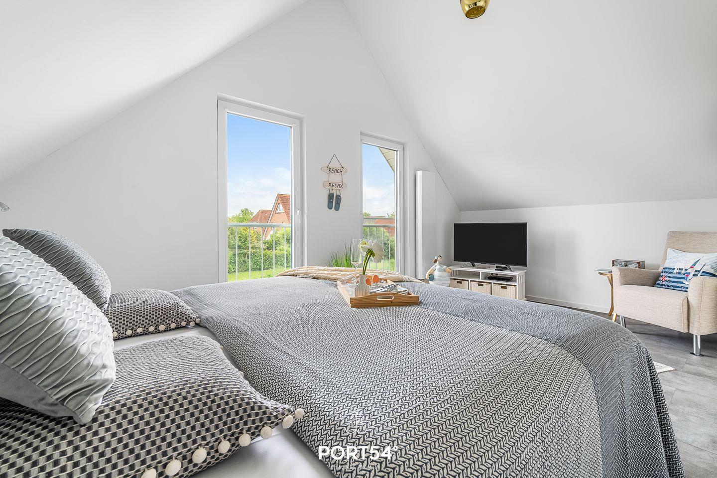 Das offen gestaltete Wohnkonzept mit einem offenen Wohn- und Essbereich und einer voll ausgestatteten Küche lädt zu gemeinsamen Aktivitäten ein. Es gibt 2 Schlafzimmer, eines mit einem Doppelbett eingerichtet und das andere Zimmer mit 2 Einzelbetten. Das Badezimmer im EG verfügt über eine Dusche & ist mit einer Infrarotsauna ausgestattet. Im oberen Badezimmer lädt eine Badewanne zum Entspannen ein. Die großzügige Terrasse lädt zu geselligen Frühstücken an der frischen Nordseeluft ein.