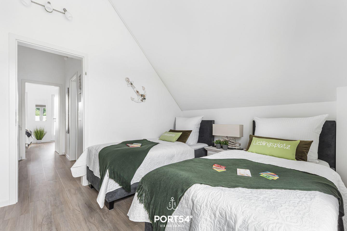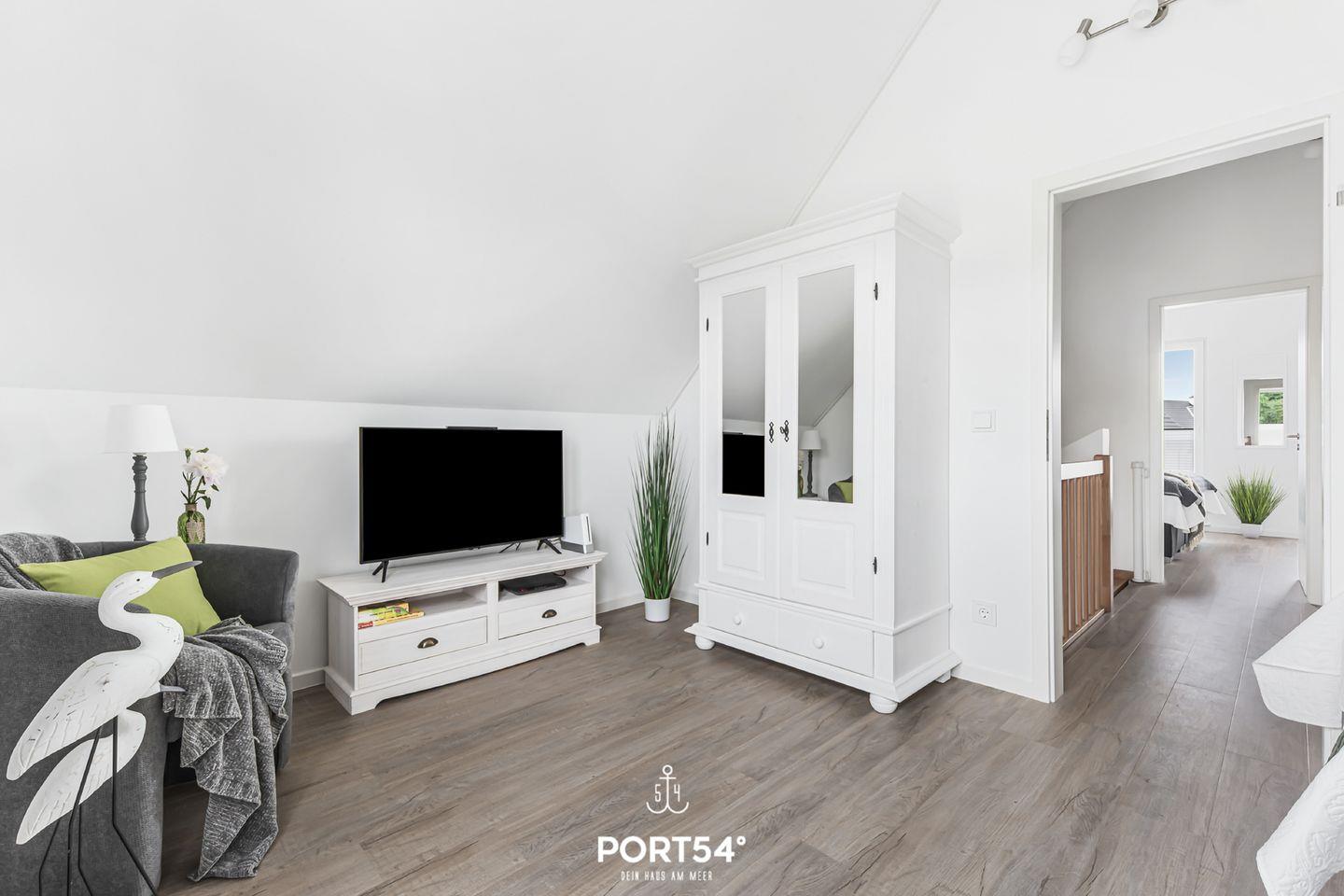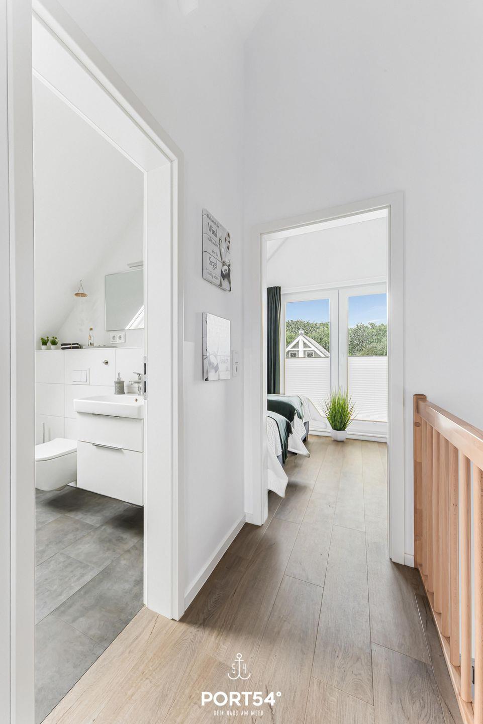 Im Obergeschoss erwarten dich zwei Schlafzimmer mit hochwertigen Boxspringbetten (1x Doppelbett, 1x zwei Einzelbetten), jeweils mit TV und ausreichend Stauraum. Ein weiteres Badezimmer mit Badewanne und Föhn sorgt für zusätzlichen Komfort. Für Familien stehen Kinderreisebett, Hochstuhl und Treppensicherung bereit.