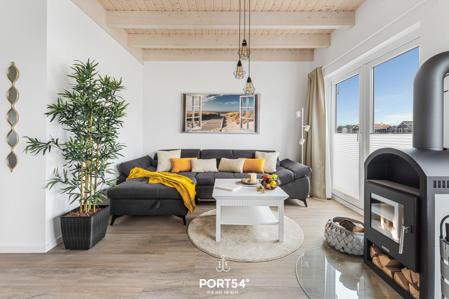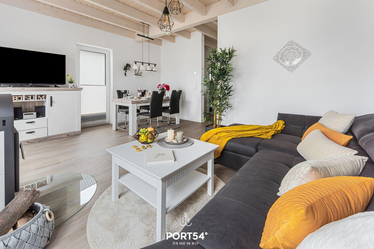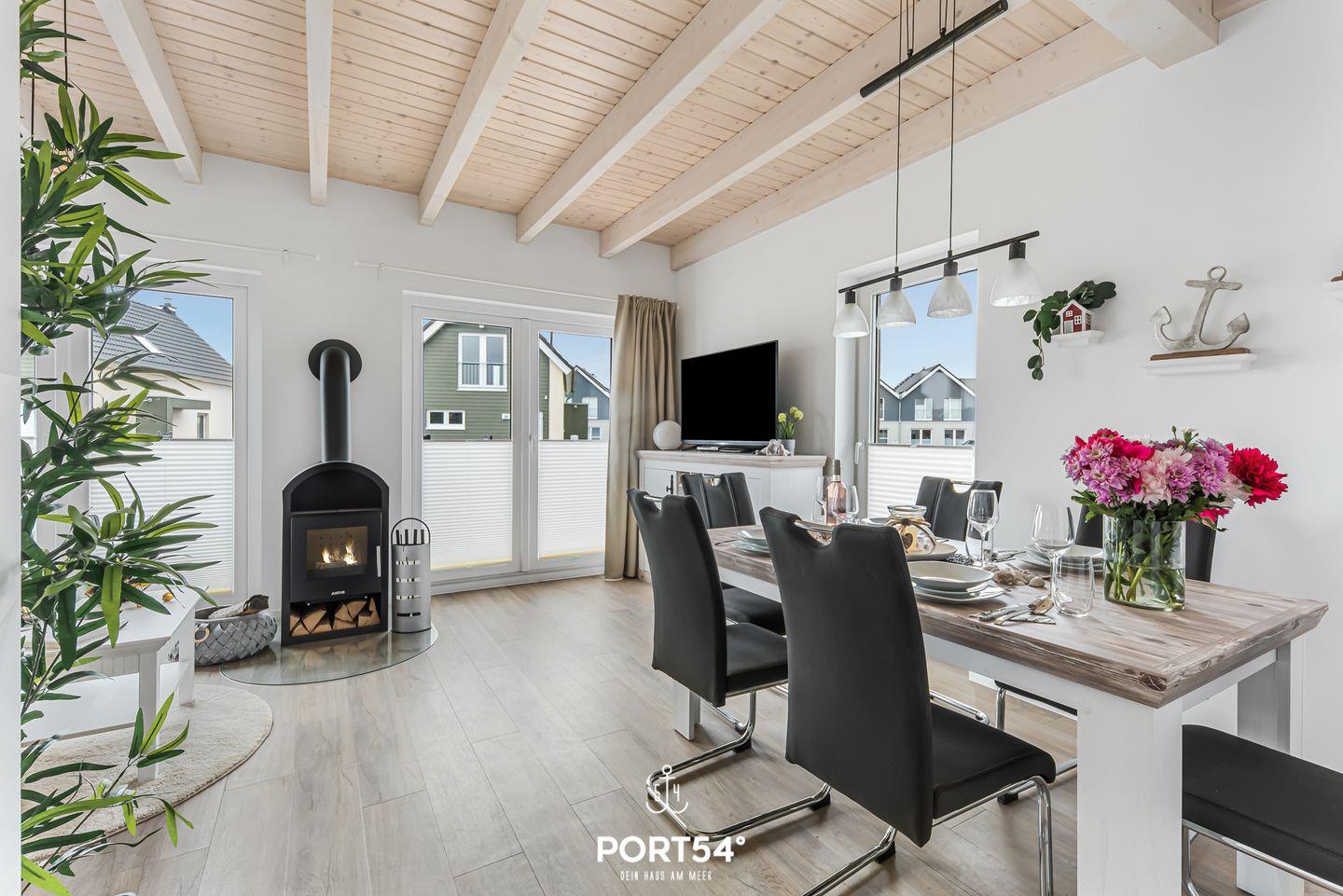 Im Erdgeschoss erwartet dich ein lichtdurchfluteter Wohn- und Essbereich mit bodentiefen Fenstern und direktem Zugang zur sonnigen Süd-Terrasse sowie zur Grünfläche. Das gemütliche Sofa (mit Schlaffunktion), ein großer Esstisch und ein Flachbild-TV laden zum gemeinsamen Entspannen ein. An kühleren Tagen sorgt der Kamin für eine besonders behagliche Atmosphäre. Für Unterhaltung ist ebenfalls gesorgt: Spiele, Wii-Konsole und ein Bluetooth-CD-Player stehen bereit.