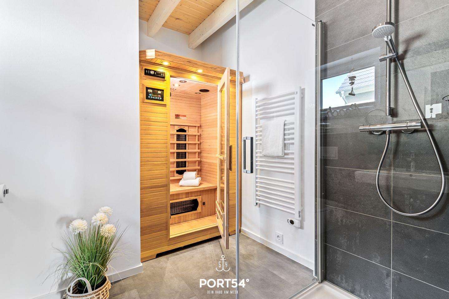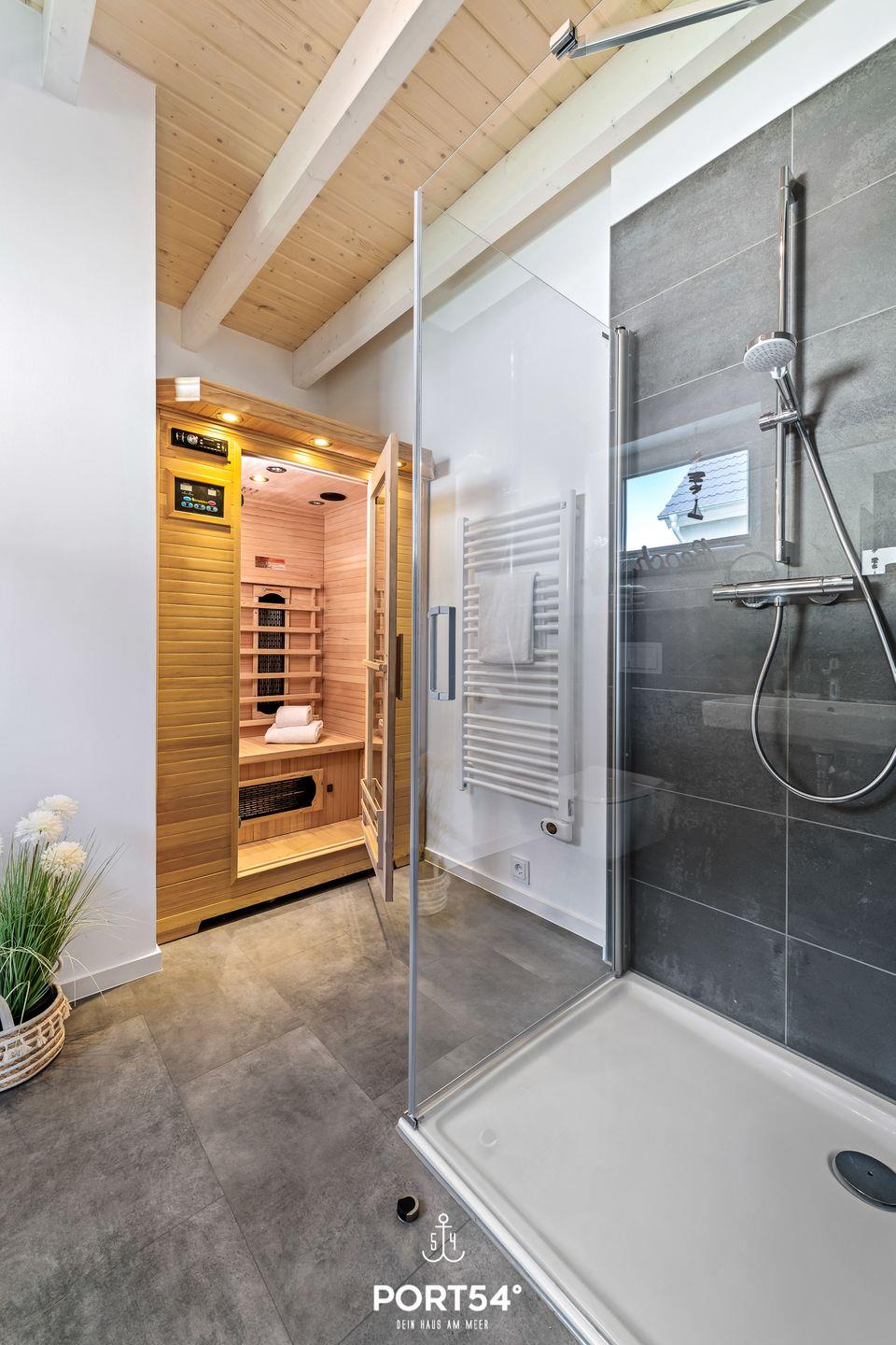 Im Obergeschoss befinden sich zwei komfortable Schlafzimmer: eines mit einem Doppelbett (180x200 cm) und eines mit zwei Einzelbetten (je 90x200 cm) – ideal für Familien oder Freunde. Zwei Badezimmer sorgen für zusätzlichen Komfort. Im Erdgeschoss findest du ein Bad mit Dusche und Infrarot-Sauna, perfekt zum Entspannen nach langen Spaziergängen. Im Obergeschoss steht dir ein weiteres Badezimmer mit Badewanne zur Verfügung.