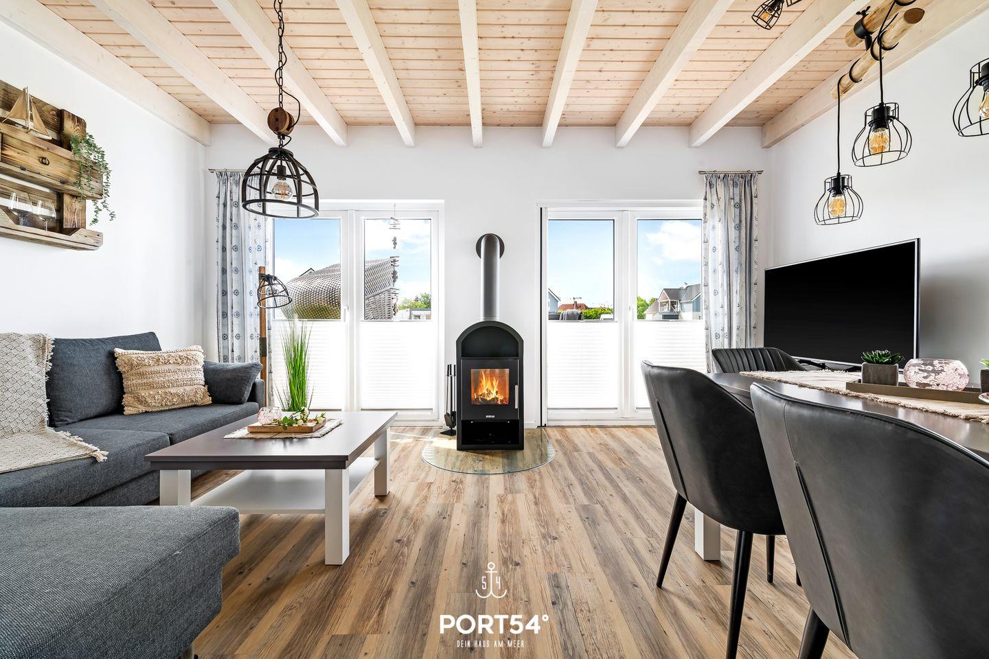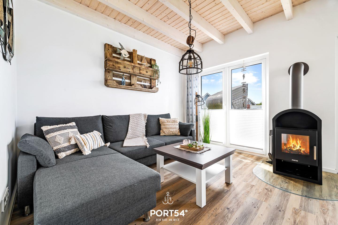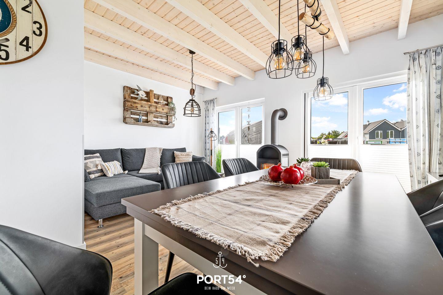 Im Erdgeschoss erwartet dich eine voll ausgestattete Küche, in der du alles findest, was du für entspannte Kochabende brauchst. Der offen gestaltete Wohn- und Essbereich ist lichtdurchflutet und lädt mit einer gemütlichen Schlafcouch, einem großzügigen Esstisch und einem Kamin zum Verweilen ein. Hier kannst du nach einem erlebnisreichen Tag an der Nordsee zur Ruhe kommen, ein gutes Buch lesen oder den Abend in behaglicher Atmosphäre ausklingen lassen.