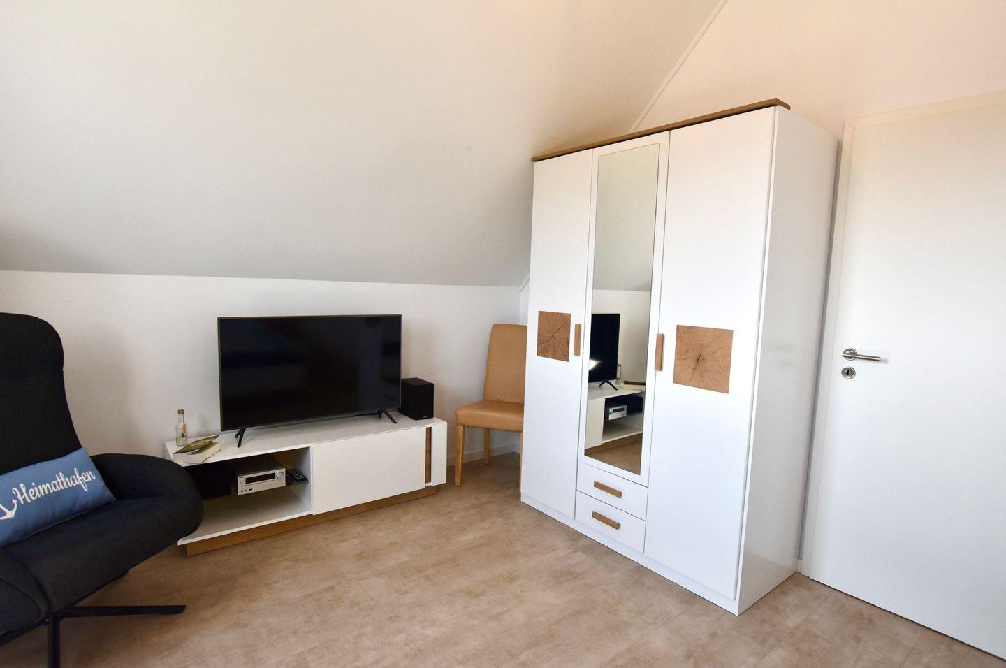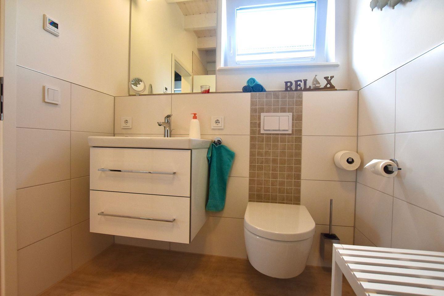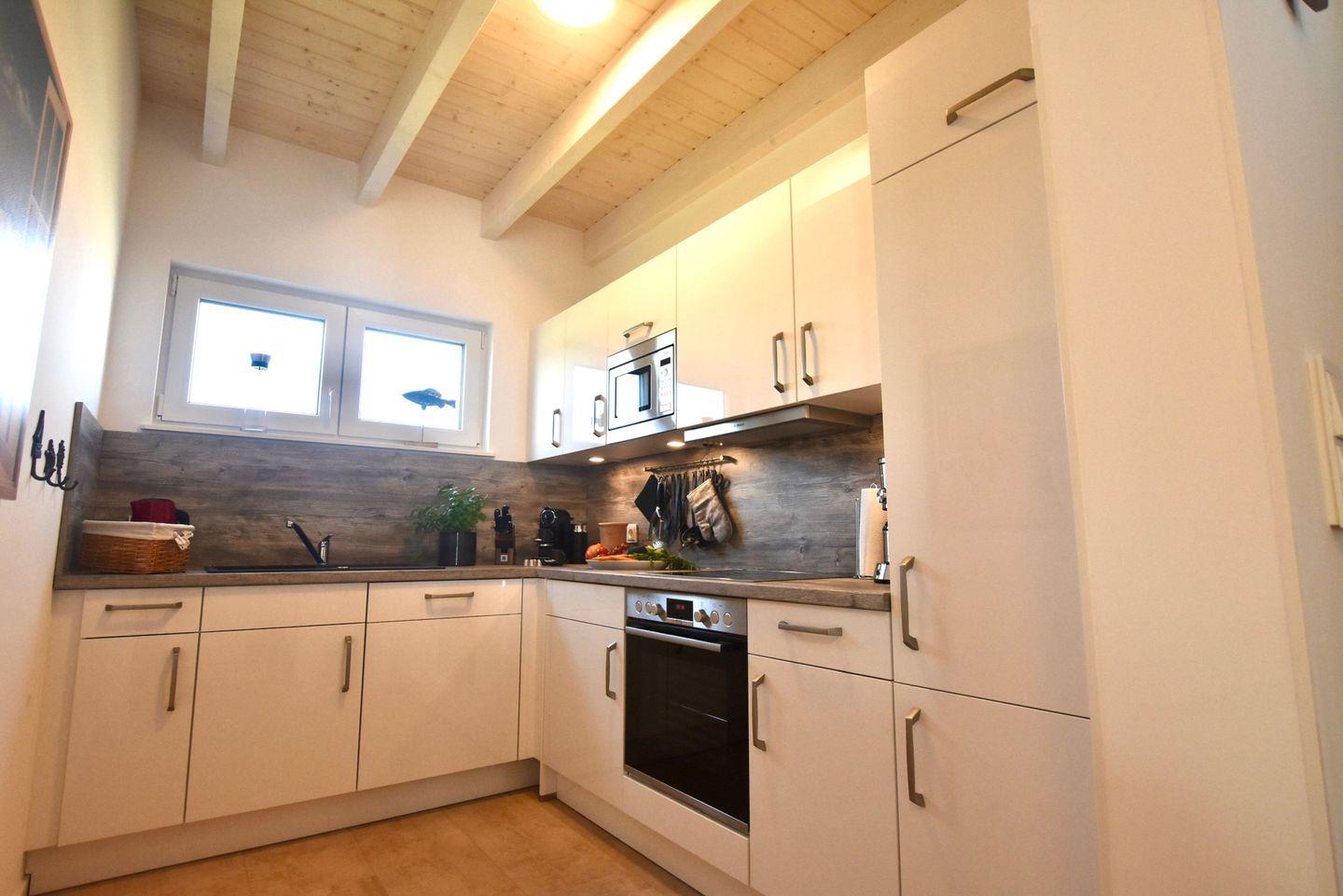 Die separate, voll ausgestattete Küche bietet dir alles, was du für die Selbstversorgung benötigst – ideal für entspannte Kochabende. Ebenfalls im Erdgeschoss befindet sich ein modernes Badezimmer mit Dusche sowie einer Infrarot-Sauna, in der du nach langen Spaziergängen am Meer wunderbar entspannen kannst.
