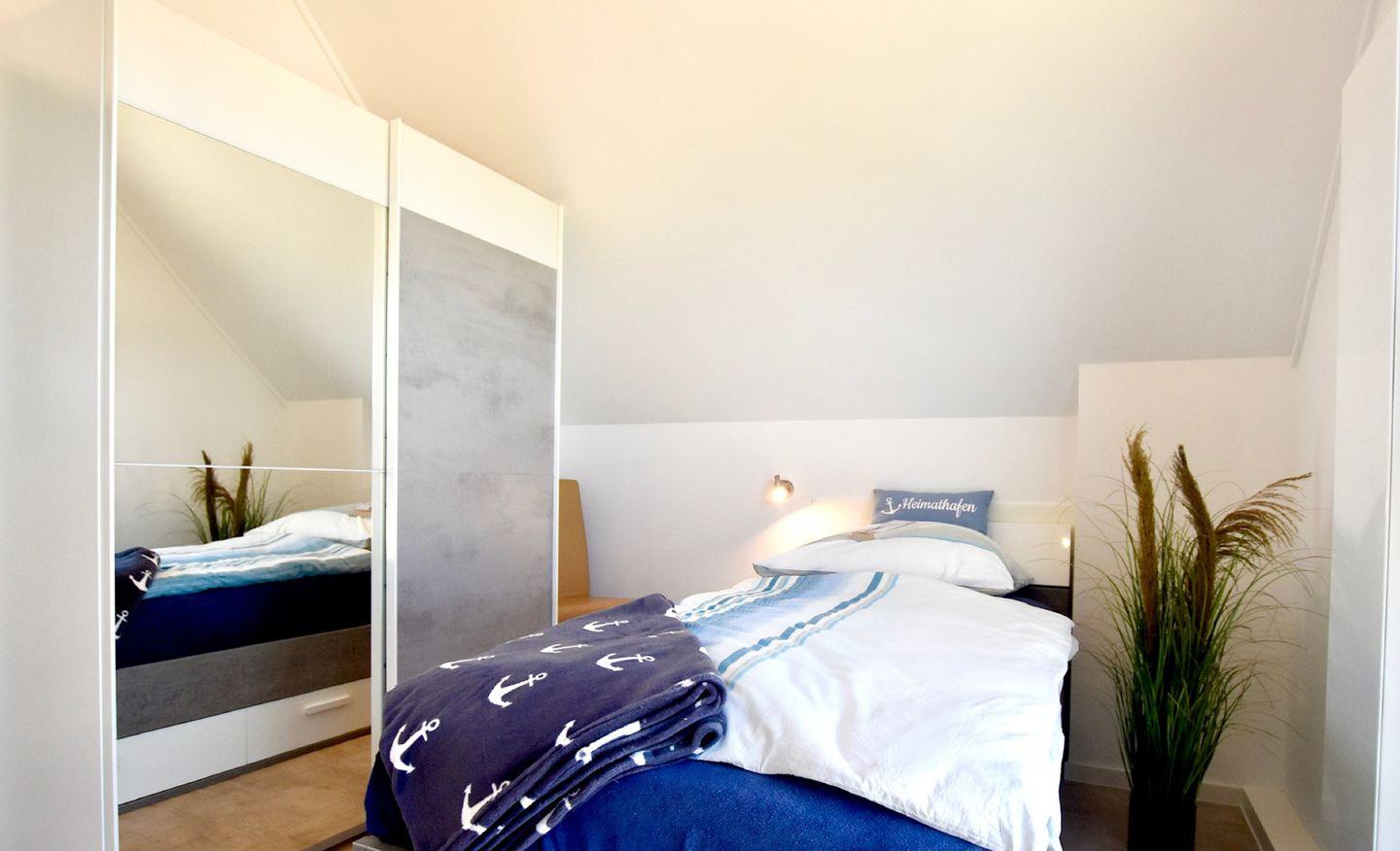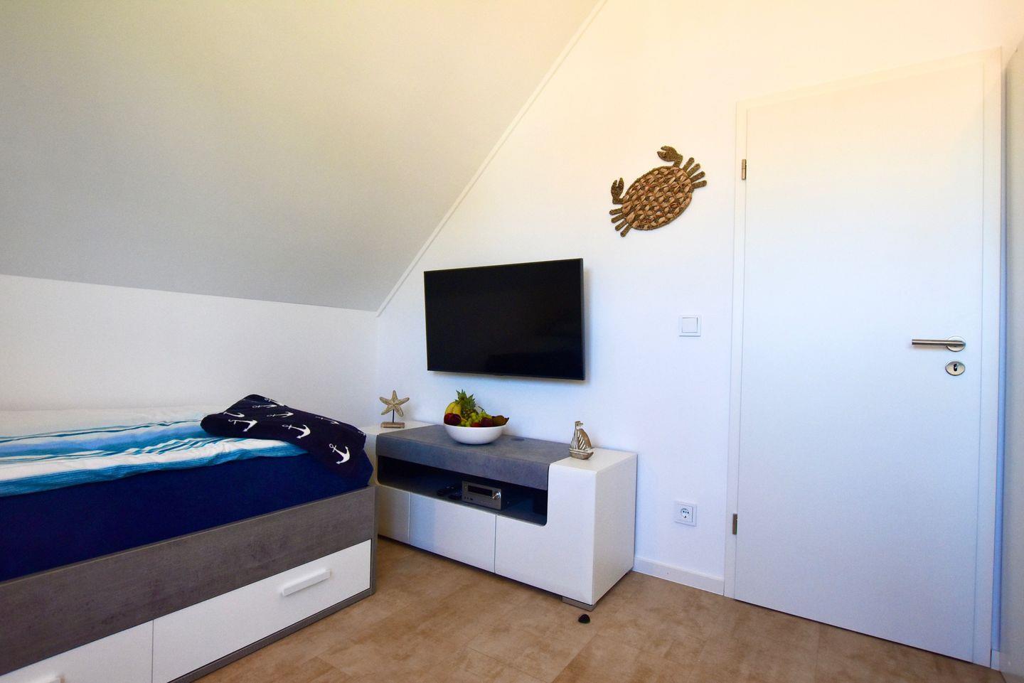 Im Obergeschoss findest du zwei gemütliche Schlafzimmer, die erholsame Nächte garantieren. Ein Schlafzimmer ist mit einem komfortablen Doppelbett (180x200 cm) ausgestattet, das zweite mit zwei Einzelbetten (je 90x200 cm). Beide Räume verfügen über Flatscreen-TV, Insektenschutzgitter, DVD-Player und eine Musikanlage. Zusätzlich steht dir im Obergeschoss ein weiteres Badezimmer mit Badewanne zur Verfügung.