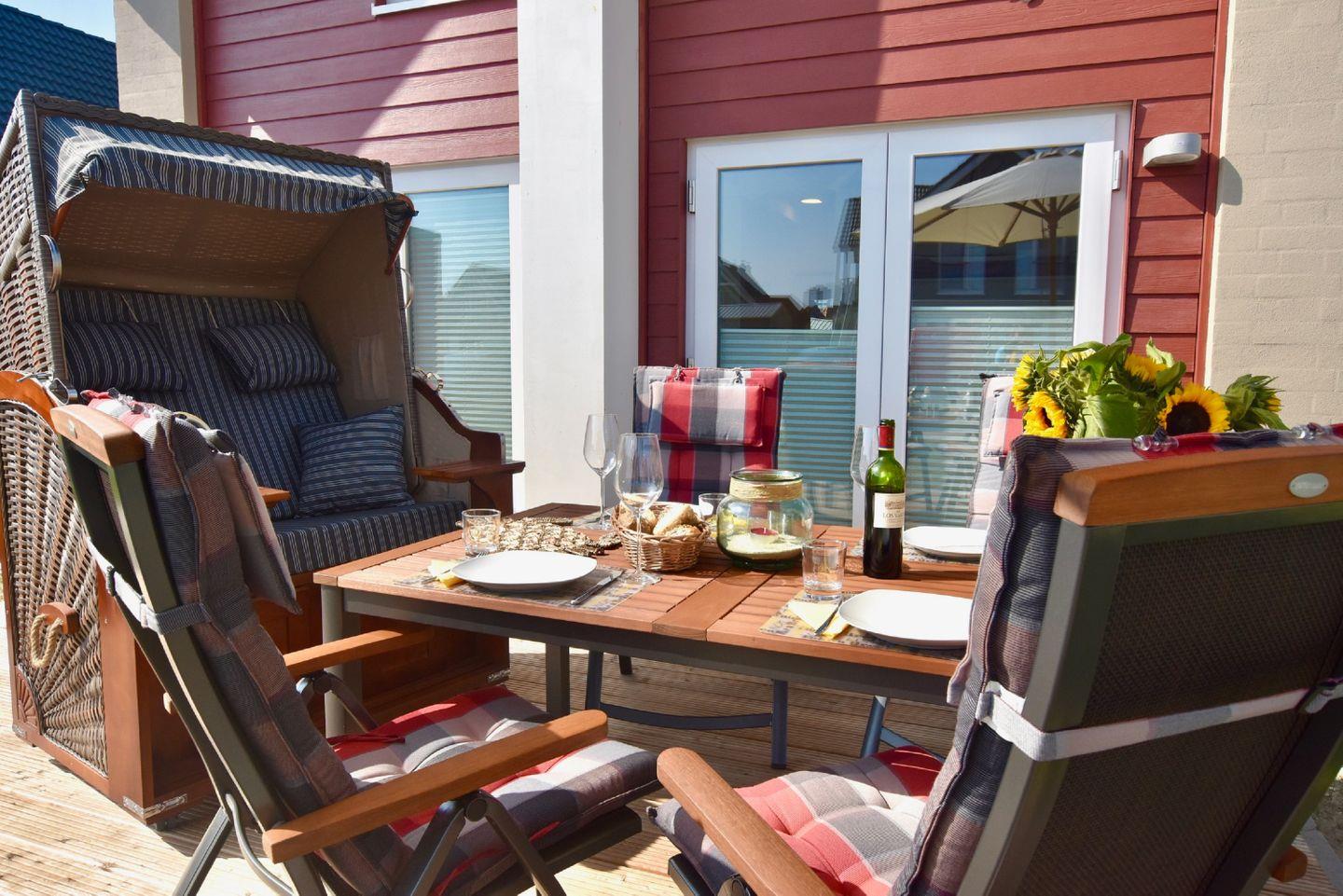 Die Süd-Terrasse lädt zum Verweilen ein – ob beim Frühstück an der frischen Nordseeluft, beim Grillen oder entspannt im Strandkorb mit einem Glas Wein. Für deine Fahrräder oder Wassersport-Ausrüstung steht dir ein privater, abschließbarer Schuppen direkt am Haus zur Verfügung. Zusätzlich gibt es Fahrradbügel sowie zwei kostenfreie PKW-Stellplätze.