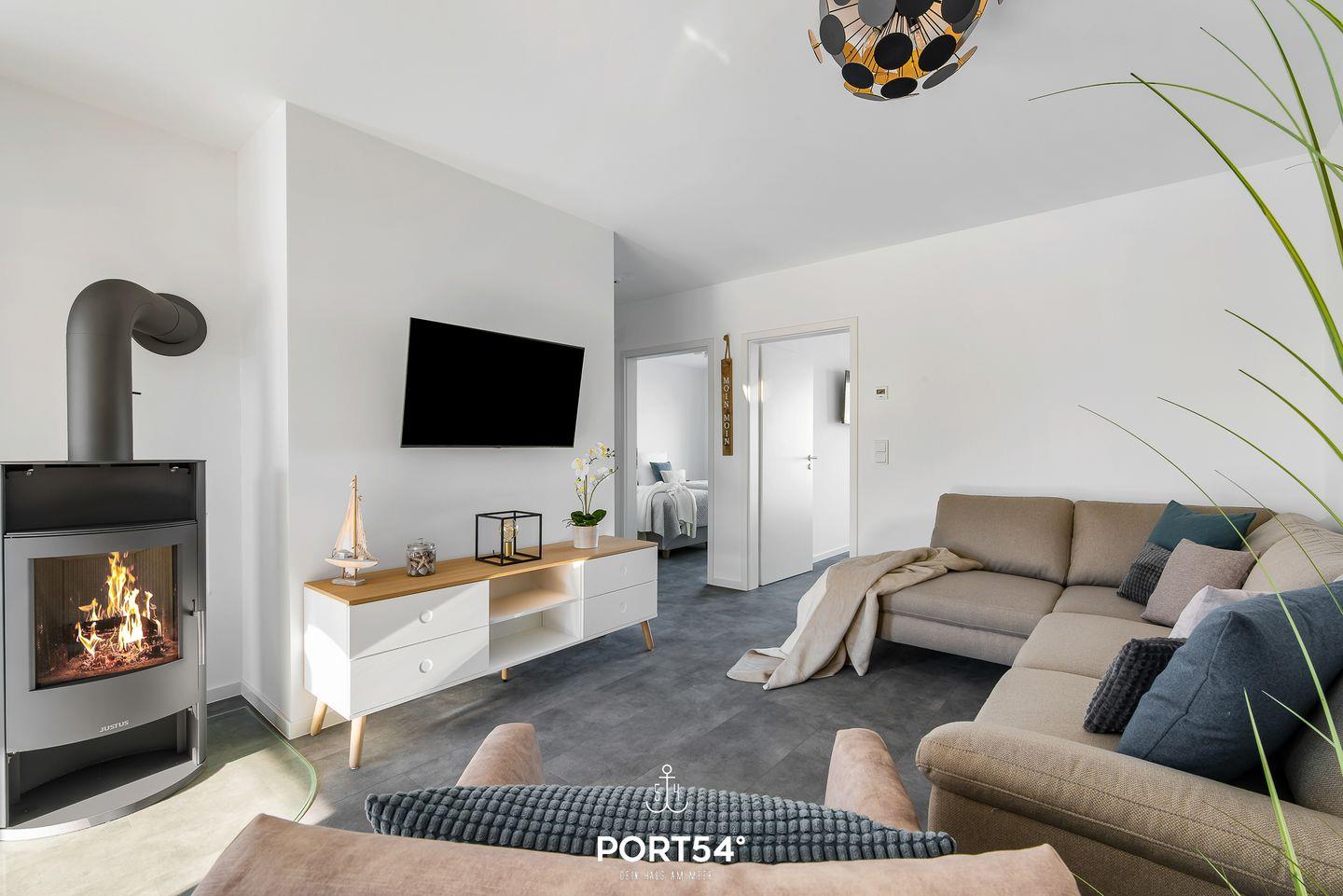Das großzügige Wohnzimmer lädt mit seiner großen Wohnlandschaft zum Entspannen, Lesen oder zu gemütlichen Filmabenden ein. Die Sofalandschaft kann bei Bedarf zudem als Schlafsofa für bis zu zwei weitere Personen genutzt werden. Für Unterhaltung ist bestens gesorgt: Neben einem Smart-TV mit vielen vorinstallierten Apps wie Netflix und Prime steht dir auch ein Bluetooth-Radio zur Verfügung. So kannst du deinen Urlaubstag ganz entspannt ausklingen lassen – ganz gleich, ob bei einem Filmabend oder mit deiner Lieblingsmusik im Hintergrund.