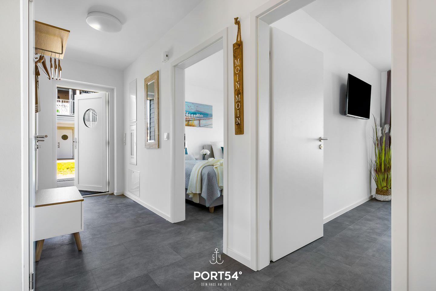 Auch für Familien mit kleinen Kindern ist die „Krabbenkoje“ bestens ausgestattet: Ein Hochstuhl und ein Kleinkinderreisebett stehen selbstverständlich zur Verfügung. Das moderne Tageslicht-Badezimmer rundet den Wohnkomfort ab und verfügt über eine barrierefreie Dusche, eine Badewanne sowie Insektenschutzgitter.