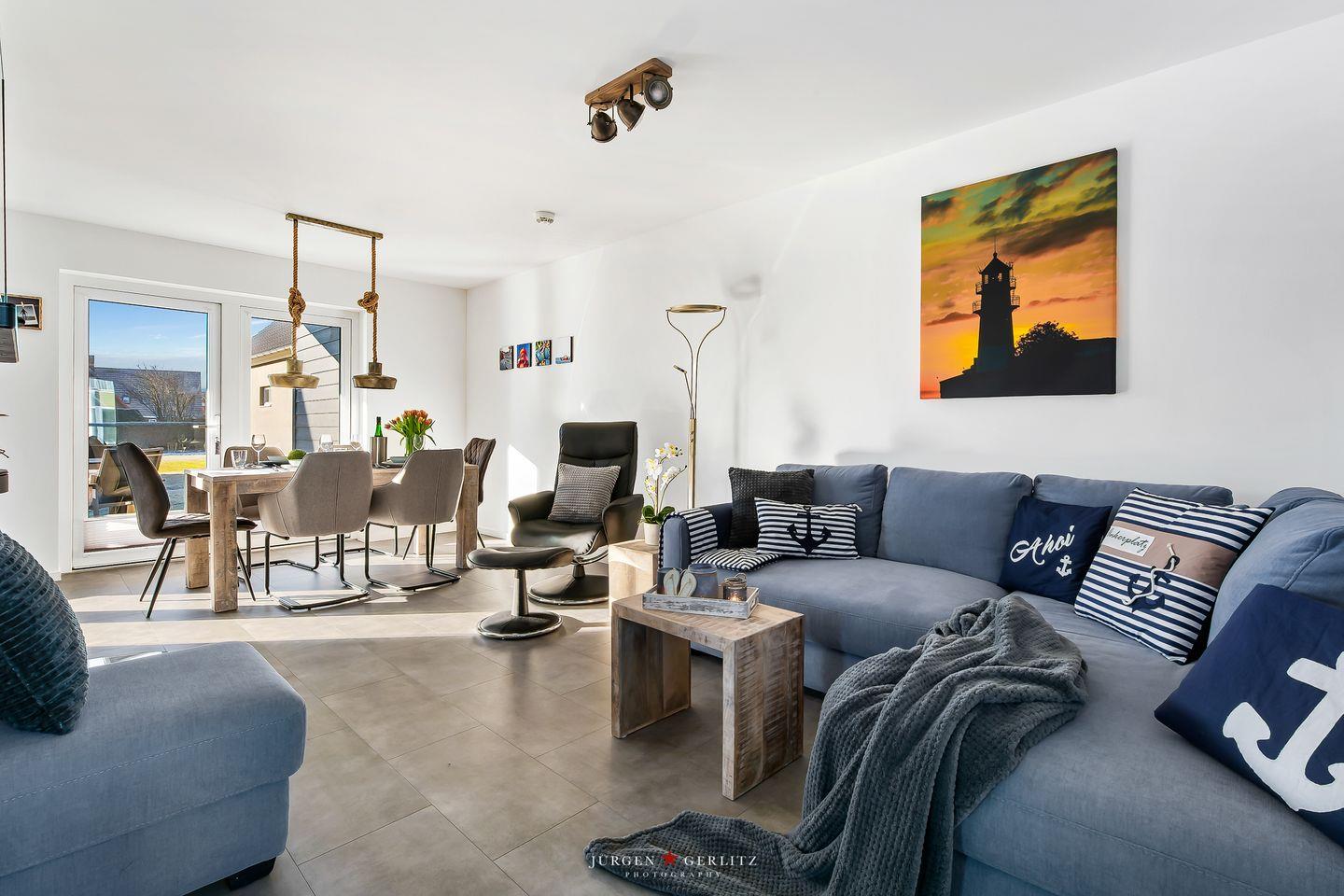Schon beim Betreten spürst du die freundliche und einladende Stimmung dieser besonderen Ferienwohnung. Das Herzstück ist der offene Wohn- und Essbereich, der mit seinem lichtdurchfluteten Ambiente sofort Urlaubsgefühl vermittelt. Hier kannst du es dir auf dem bequemen Schlafsofa gemütlich machen, gemeinsam essen, lachen oder nach einem langen Tag an der frischen Nordseeluft einfach entspannen. An kühleren Tagen sorgt der Kamin für wohlige Wärme und eine besonders behagliche Atmosphäre – perfekt für ruhige Abende mit einem guten Buch, einem Glas Wein oder netten Gesprächen in geselliger Runde.