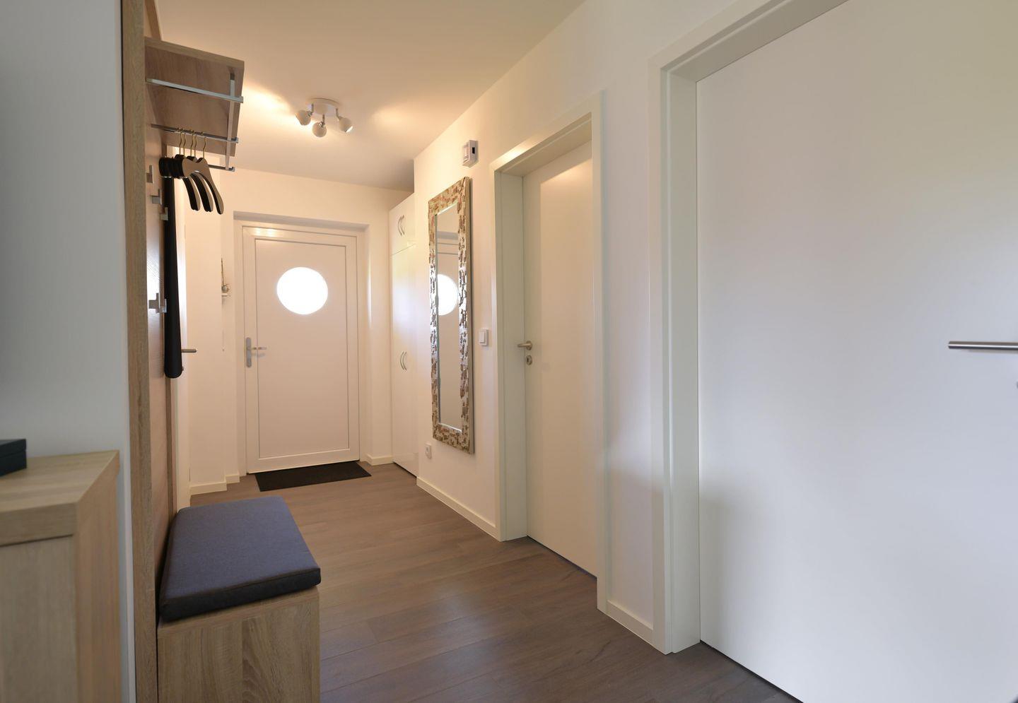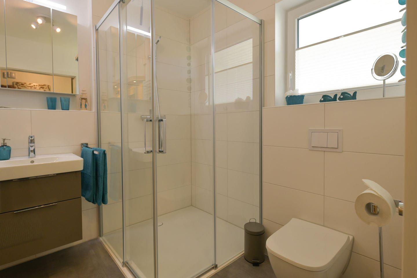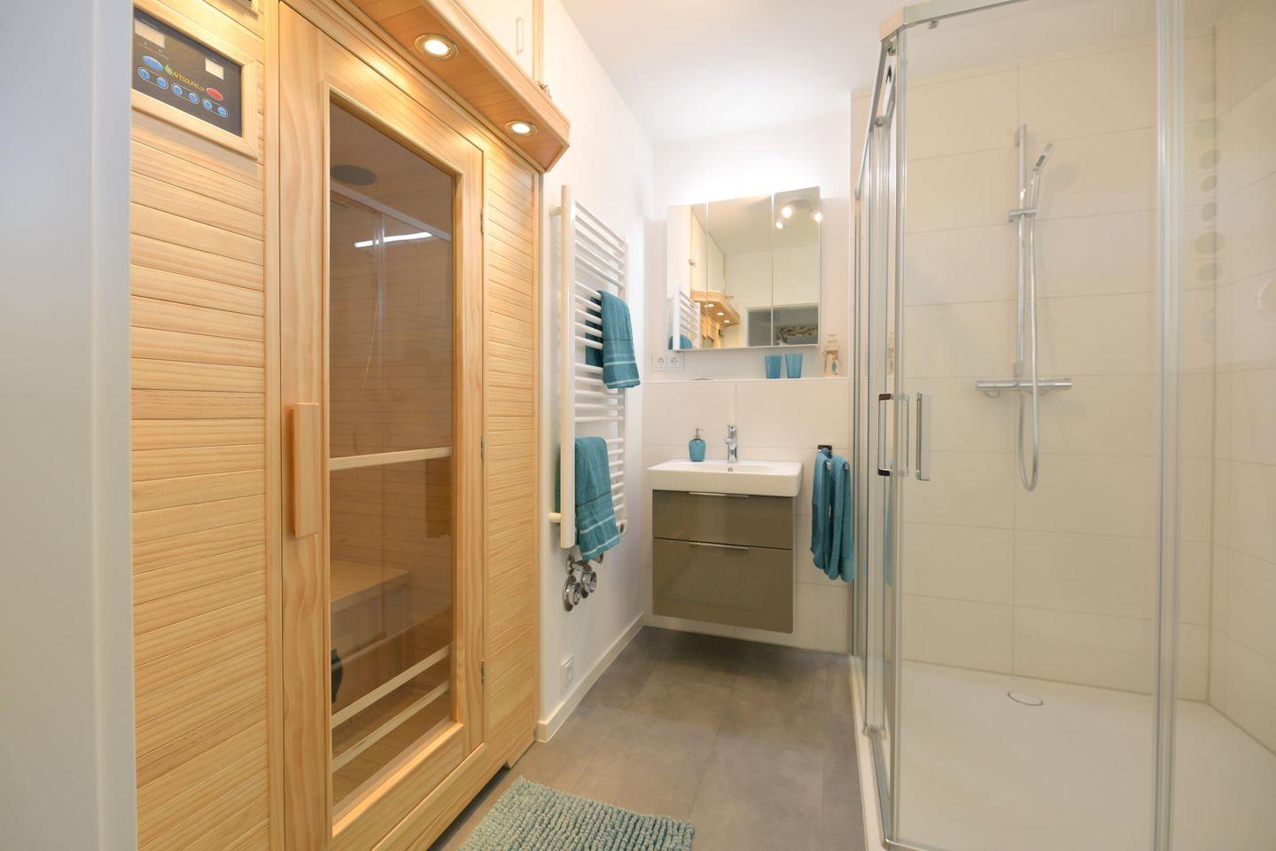 Das moderne Badezimmer überzeugt nicht nur mit einer barrierefreien Dusche, sondern auch mit einer Infrarotkabine, die besonders in den kühleren Monaten für wohlige Entspannung sorgt. Gerade nach einem windigen Spaziergang an der Nordsee ist sie die perfekte Ergänzung zum Kaminofen und macht die Wohnung auch in der kalten Jahreszeit zu einem wunderbaren Ort zum Aufwärmen und Abschalten. Die Türöffnung der Dusche mit den Maßen 1,20 x 1,20 m unterstreicht den komfortablen, barrierearmen Charakter der Wohnung.