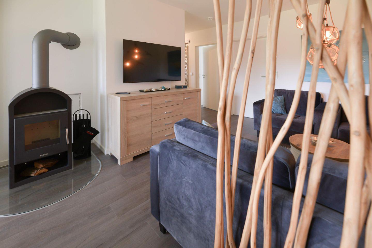 Das gemütliche Wohnzimmer lädt nach einem erlebnisreichen Tag an der Nordsee zum Ankommen und Abschalten ein. Hier kannst du es dir nach einem Spaziergang an der frischen Seeluft so richtig gemütlich machen. Der Kaminofen sorgt besonders in der kalten Jahreszeit für eine wunderbar behagliche Atmosphäre und schenkt dir wohltuende Wärme. Gemeinsam mit dem Flatscreen-TV entsteht so ein Wohnbereich, in dem du entspannte Abende verbringen und den Urlaub in vollen Zügen genießen kannst.
