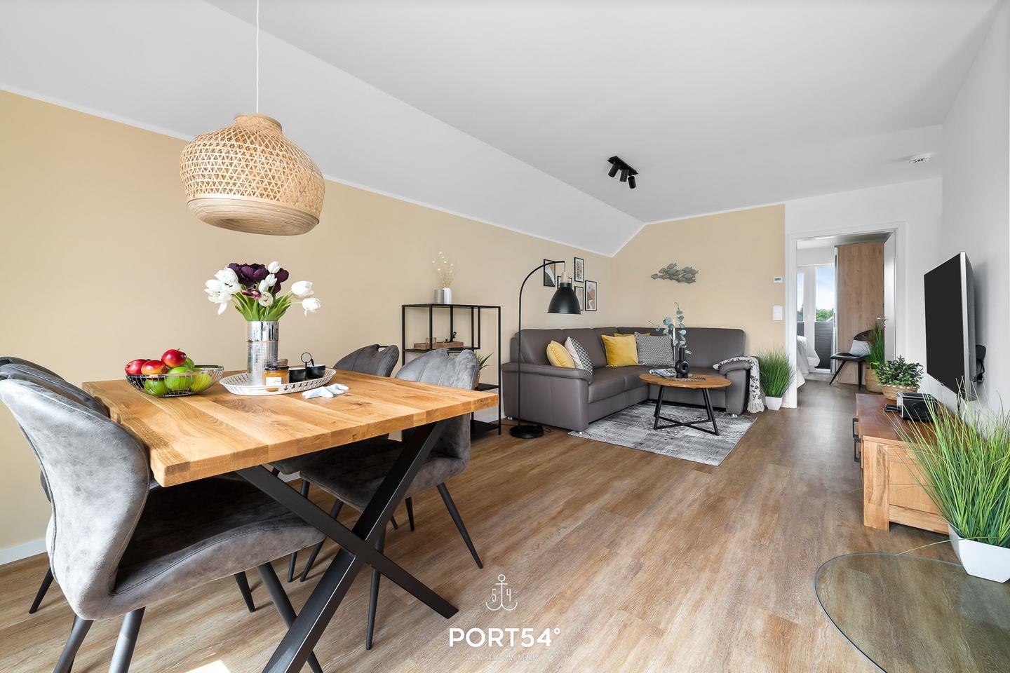 Schon beim Betreten überzeugt die Ferienwohnung mit ihrem offenen, lichtdurchfluteten Wohnkonzept. Die helle und freundliche Gestaltung schafft sofort eine entspannte Urlaubsatmosphäre, in der du dich vom ersten Moment an willkommen fühlst. Der moderne Wohnbereich lädt mit einem bequemen Ecksofa ein. Ein Smart-TV mit Magenta-TV, ein DAB-Radio, eine kleine Auswahl an Büchern sowie einige Gesellschaftsspiele sorgen für gemütliche und unterhaltsame Stunden.