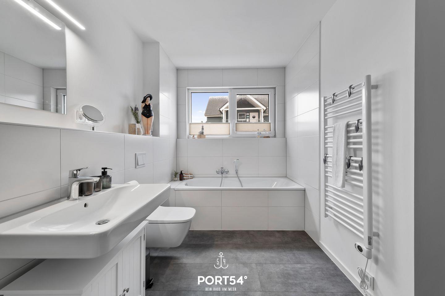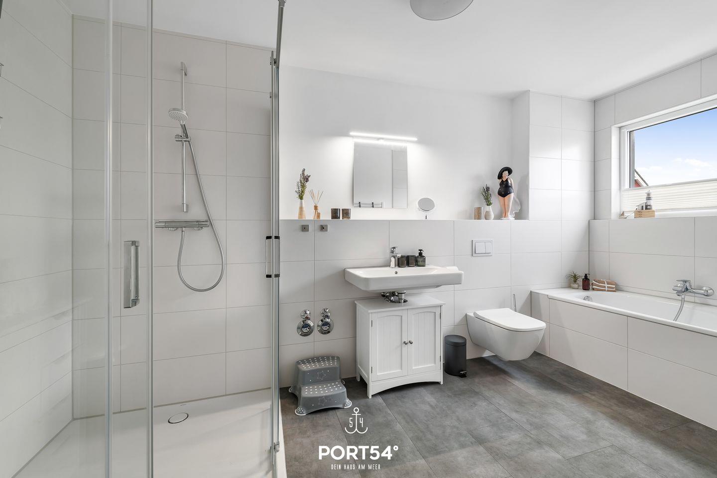 Das großzügige Badezimmer mit Badewanne und ebenerdiger Dusche bietet dir viel Platz zum Entspannen. Hier kannst du nach einem langen Strandtag oder einem aktiven Urlaubstag wunderbar abschalten und dir eine kleine Auszeit gönnen.