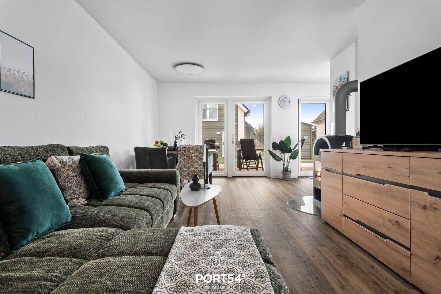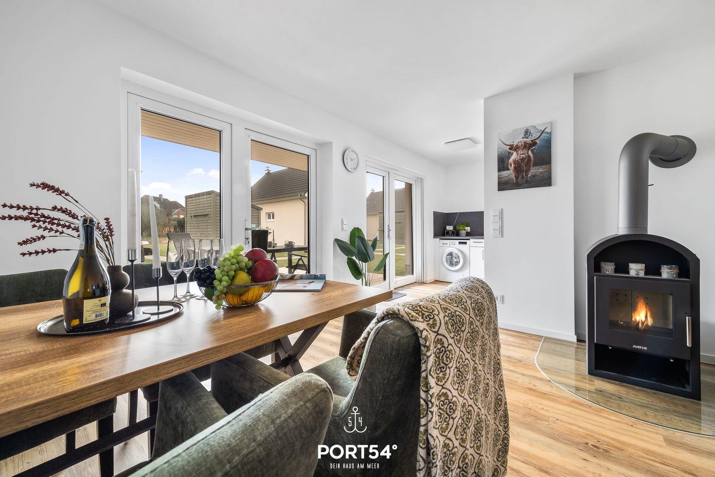 Schon beim Betreten spürst du die freundliche und einladende Stimmung der Wohnung. Der geräumige Wohnbereich ist modern und zugleich gemütlich eingerichtet und lädt dazu ein, gemeinsame Stunden mit Familie oder Freunden zu verbringen. Ein bequemes Sofa, ein Flachbild-TV und sogar eine Nintendo Switch sorgen für Unterhaltung und entspannte Urlaubsmomente. Besonders in der kalten Jahreszeit entfaltet die Wohnung ihren ganz besonderen Charme: Dann sorgt ein knisterndes Feuer im Kamin für wohlige Wärme und eine behagliche Atmosphäre, in der du es dir nach einem Spaziergang an der frischen Nordseeluft besonders gemütlich machen kannst.