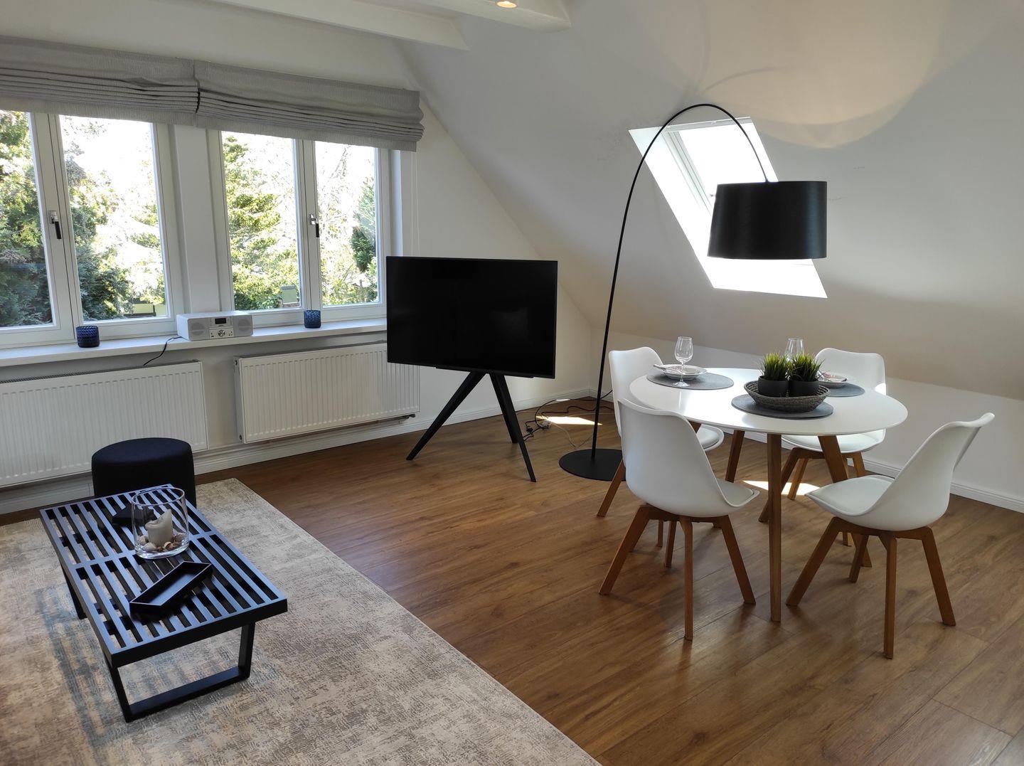 Willkommen in der "Witten Stuuv" in Büsum! Die Ferienwohnung befindet sich im ersten Obergeschoss und verfügt über einen Wohn- und Essbereich, eine Küche, ein Schlafzimmer sowie ein Badezimmer. Die Küche bietet alles, was Sie für einen Kochabend benötigen. Es gibt unter anderem einen Backofen, eine Spülmaschine, zwei Kühlschränke, einen Induktionsherd, einen Toaster, einen Handmixer, eine Filterkaffeemaschine und einen Wasserkocher. Das Schlafzimmer verfügt über ein Doppelbett (180x200cm) und Verdunkelungsmöglichkeiten. Im Badezimmer finden Sie eine ebenerdige Dusche, einen Föhn, ein WC sowie einen Handtuchtrockner vor. Im Wohnzimmer können Sie es sich vor dem Flachbild-TV auf dem Sofa gemütlich machen und bei gutem Wetter die Nordseeluft in Ihrem privaten Strandkorb am Deich in der Nähe des Leuchtturms genießen. Bitte beachten Sie, dass keine Kinder unter 12 Jahren erlaubt sind.