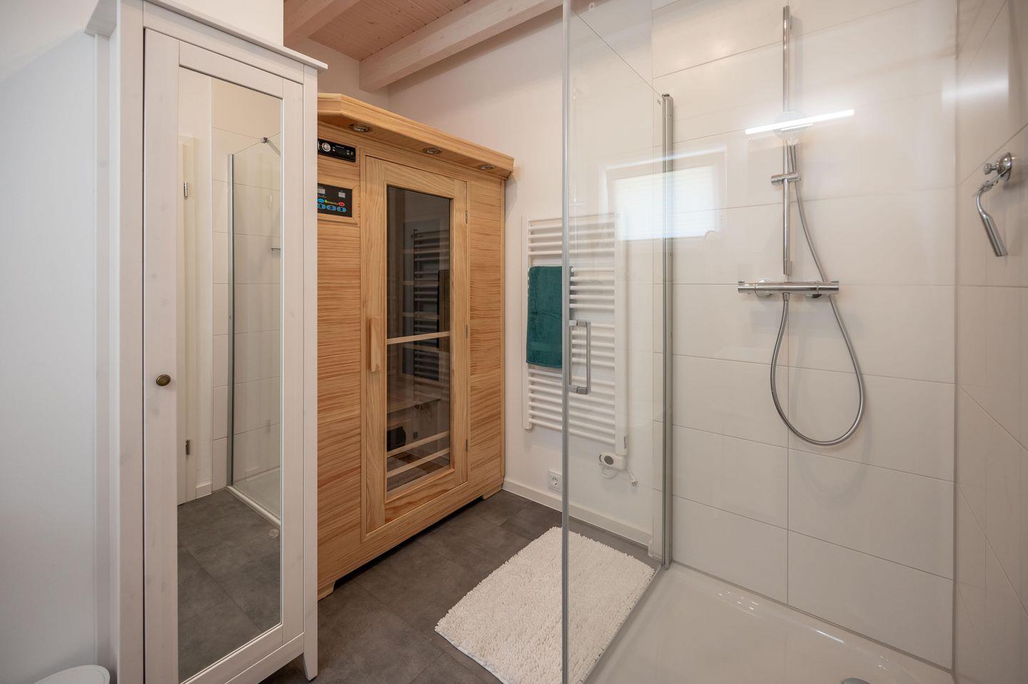 Der offene Wohn- und Essbereich mit Zugang zur Terrasse bietet einen Kaminofen. Die separate Küche ist voll ausgestattet. In den 2 Schlafzimmern im Obergeschoss sind ein Doppelbett und 2 Einzelbetten. Das Duschbad im EG bietet eine Infrarot-Sauna. Im OG befindet sich ein Vollbad. Die Terrasse lädt zum Verweilen und Grillen ein. Ein abschließbarer Fahrradschuppen und ein PKW-Stellplatz sind vorhanden.