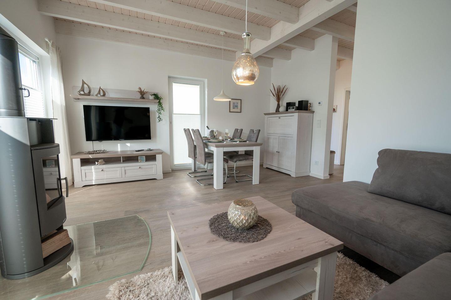 Im Erdgeschoss erwartet dich ein gemütlicher Wohnbereich mit Sofa und Essplatz. Der Kaminofen sorgt an kühleren Tagen für eine besonders behagliche Atmosphäre. Zusätzlich bieten Fußbodenheizung und Zentralheizung ganzjährig angenehmen Komfort.