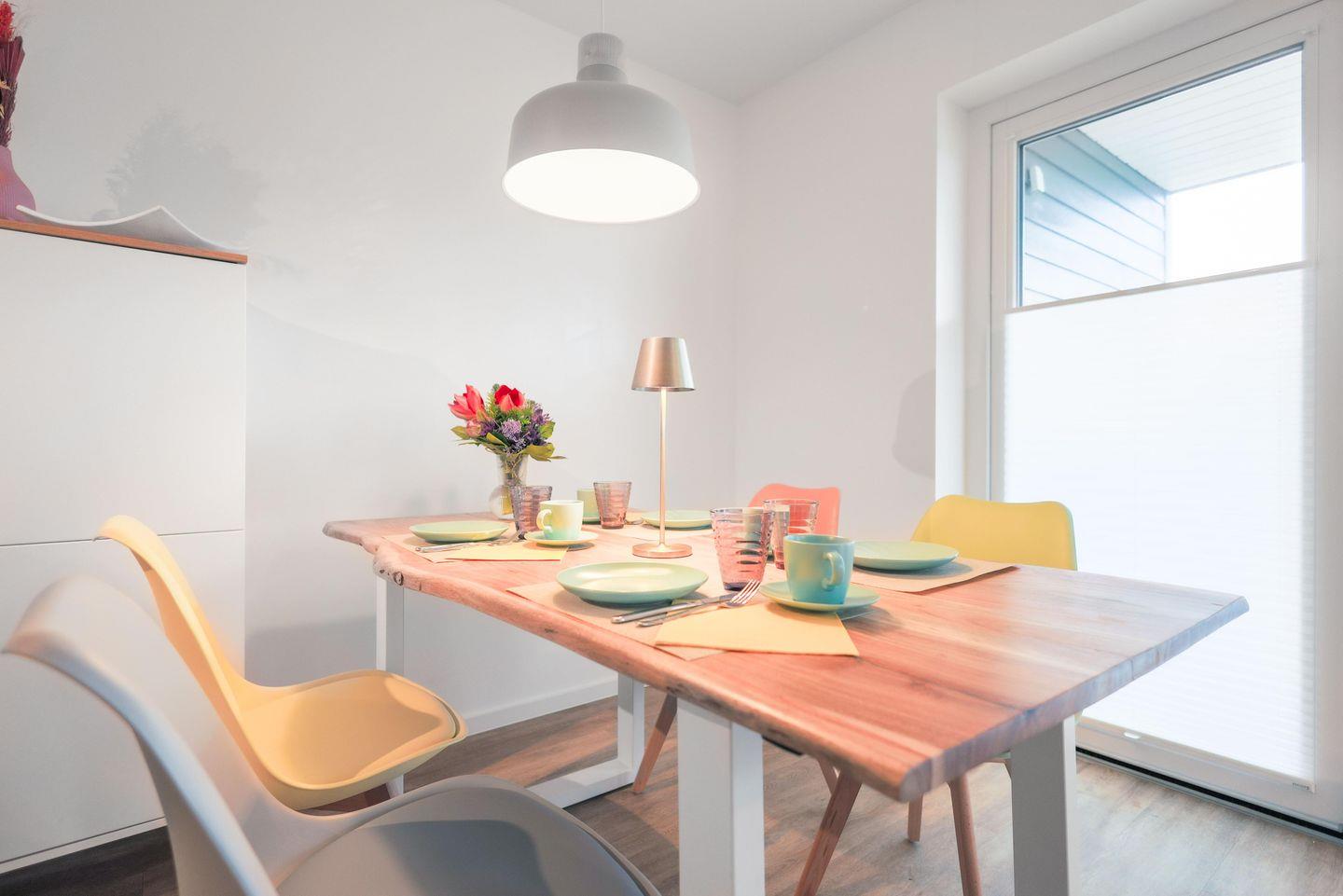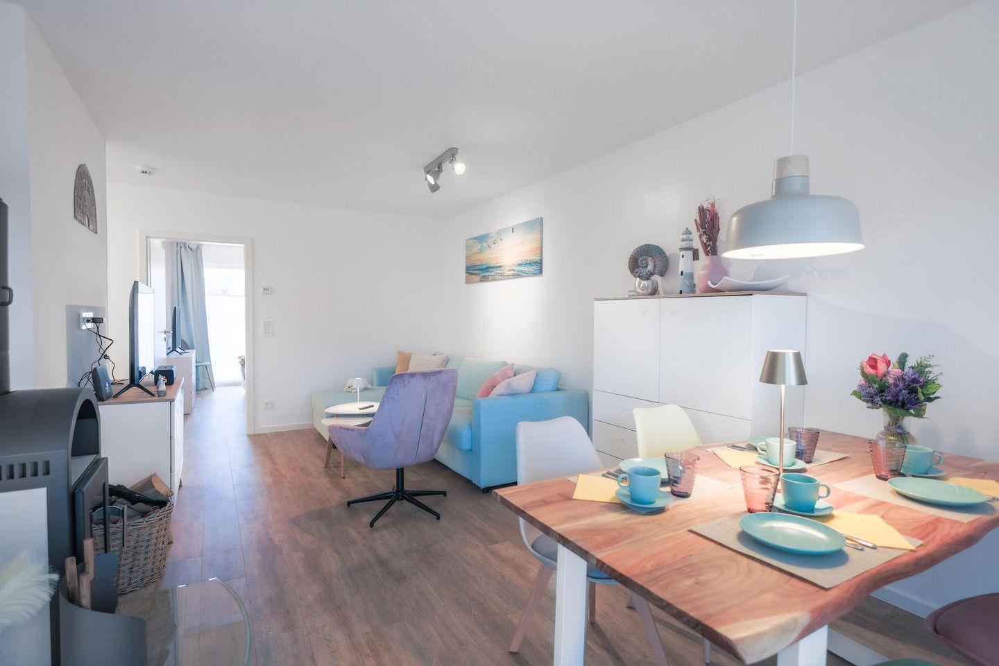 Ihr modernes Zuhause auf Zeit erwartet Sie im Erdgeschoss auf barrierearmen 80m² mit einer hochwertigen Ausstattung. Im Wohnzimmerbereich befinden sich stilvolles Mobiliar zum Relaxen oder Fernsehschauen auf dem Flatscreen-TV. Der Kamin sorgt an kühleren Tagen für Gemütlichkeit und behagliche Wärme. Am Esszimmertisch können Sie spannende Spielabende mit der ganzen Familie genießen. Die offene Küche ist hochwertig ausgestattet, sodass Sie nach Lust und Laune kochen können. Zwei Schlafzimmer sorgen mit einem Doppelbett (180x200cm) sowie zwei Einzelbetten (je 90x200cm) für erholsame Nächte. Das geräumige Badezimmer bietet eine Badewanne sowie eine bodentiefe Dusche. Für unsere kleinen Gäste stehen zudem ein Kinderreisebett und ein Hochstuhl bereit. Genießen Sie die Sonne und die Nordseeluft auf der schönen Terrasse. Neben einem Elektrogrill und Sitzgelegenheiten für 6 Personen finden Sie auch zwei Sonnenliegen zum Relaxen vor. Ein Parkplatz und ein abschließbarer Fahrradschuppen bieten Platz für Ihr Auto und mitgebrachte Fahrräder.