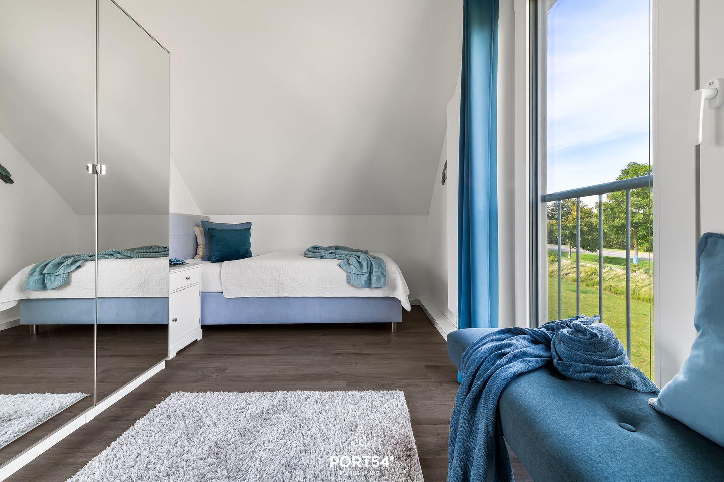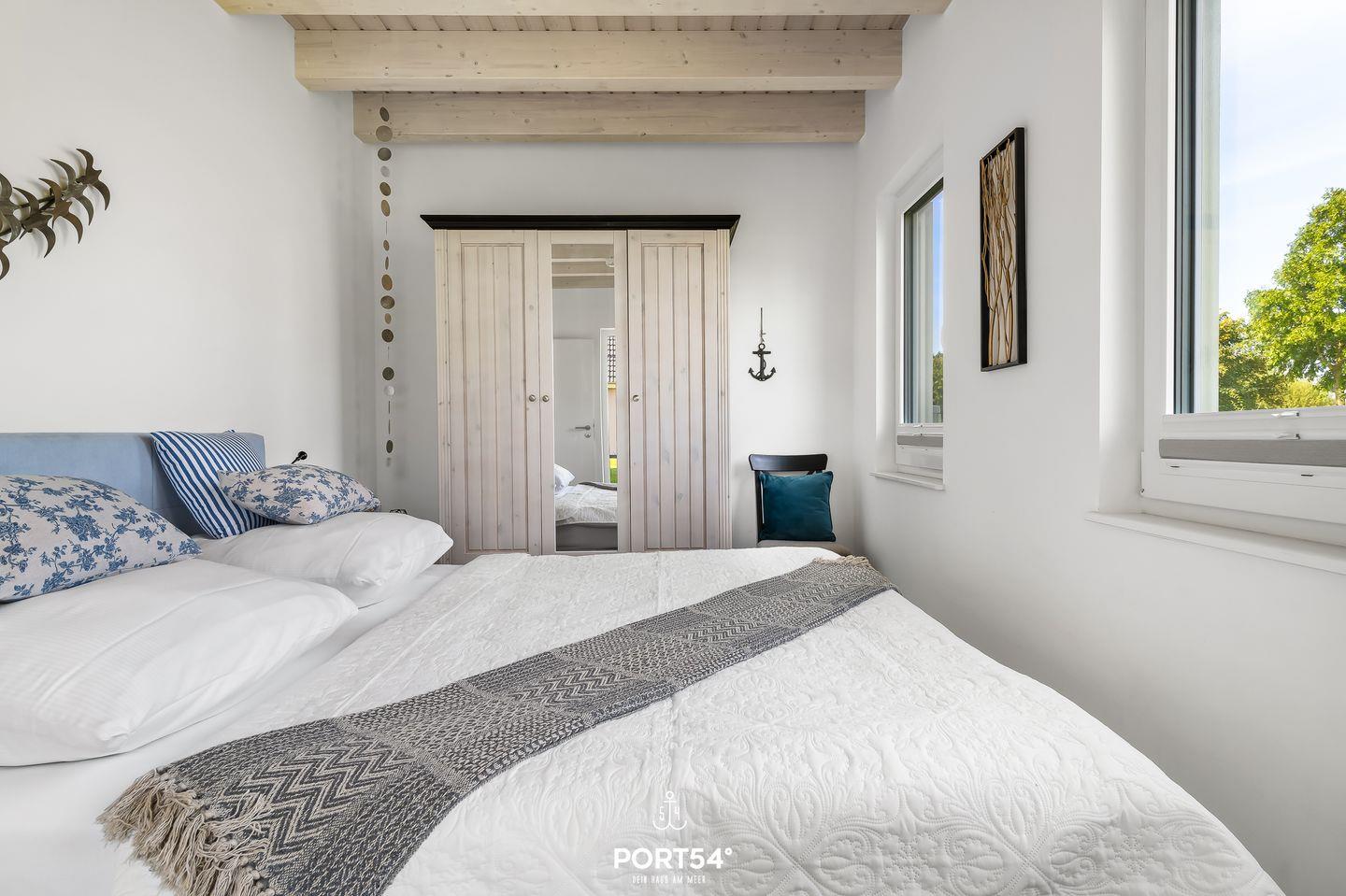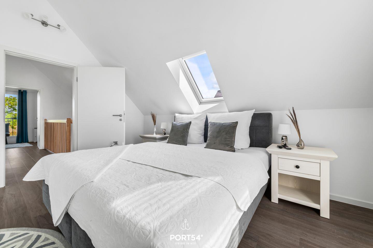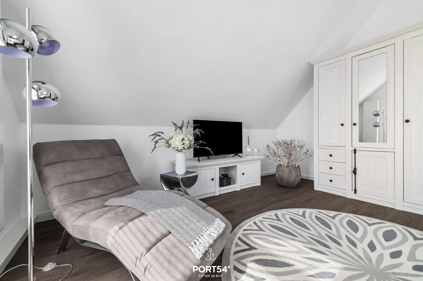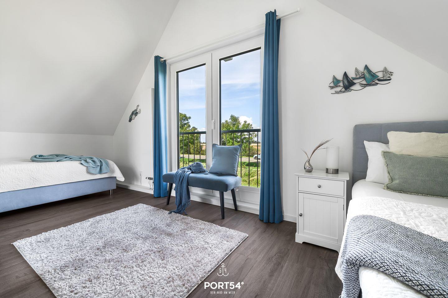 Im Obergeschoss findest Du ein großzügiges zweites Schlafzimmer mit Doppel-Boxspringbett, TV, Kleiderschrank, Relax-Liege und bodentiefen Fenstern, die viel Licht hereinlassen. Das dritte Schlafzimmer verfügt über zwei Einzelbetten, TV, Kleiderschrank und ebenfalls bodentiefe Fenster mit Verdunkelungsplissees.
