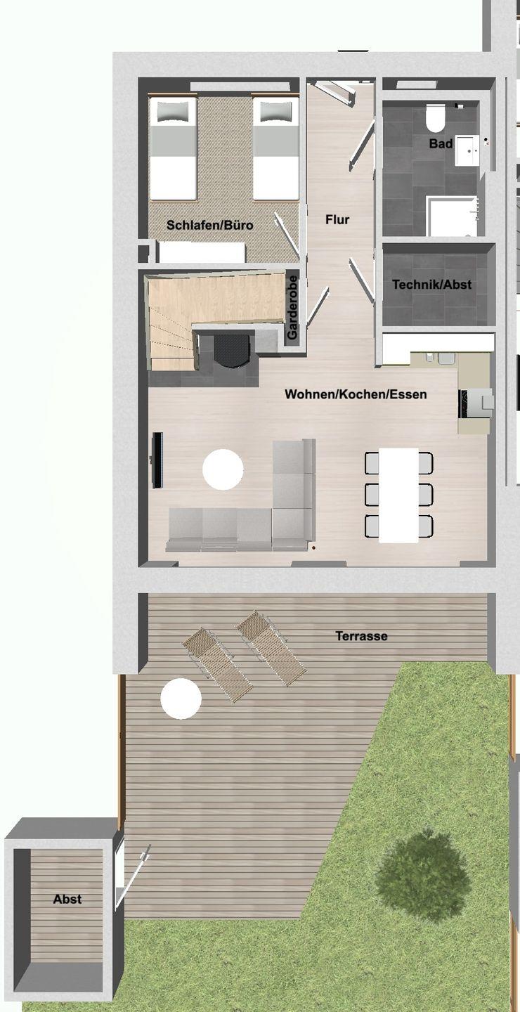 Die Süd-West-Terrasse und die Loggia im Obergeschoss sind mit Gartenmöbeln ausgestattet – hier genießt Du Sonnenstunden fast den ganzen Tag. Eine elektrische Markise spendet angenehmen Schatten, und am Abend kannst Du den Tag bei einem Grillabend am Elektrogrill entspannt ausklingen lassen.
