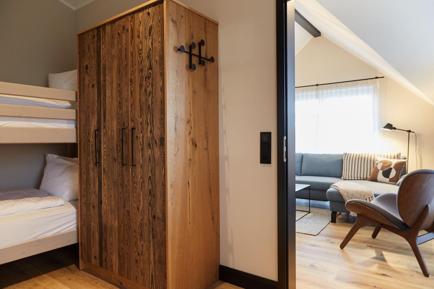 Hier warten zwei Schlafzimmer mit einem komfortablen Doppelbett bzw. Hochbett und einem Smart-TV ausgestattet. Die moderne Küche ist offen zum Wohnzimmer ausgerichtet – hier finden Sie u. a. einen Induktionsherd, Spülmaschine und Backofen. Der Balkon ist perfekt, um ein Buch zu lesen, zu entspannen oder einfach nur, um sich die herrliche Nordseeluft um die Nase wehen zu lassen …