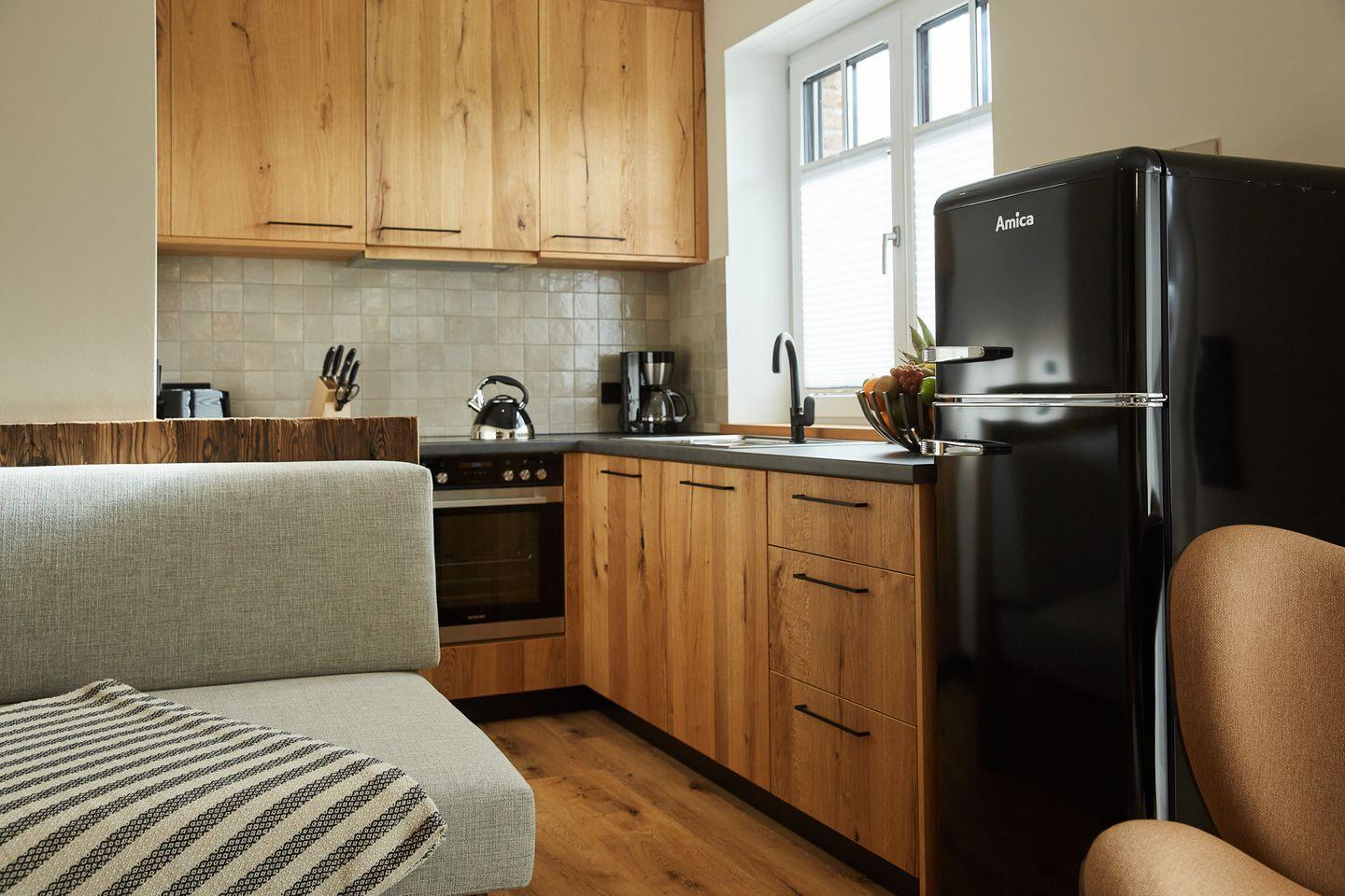 Auf rund 76 Quadratmetern finden vier Gäste Ihr kleines Urlaubsrefugium mit einer modernen und hochwertigen Ausstattung. Genießen Sie das entspannte Ambiente im lässigen Industrial Style, das gleichzeitig jede Menge Cozyness versprüht. Zusätzlich sorgen schallisolierte 3-fach verglaste Fenster und eine Fußbodenheizung für maximale Behaglichkeit.