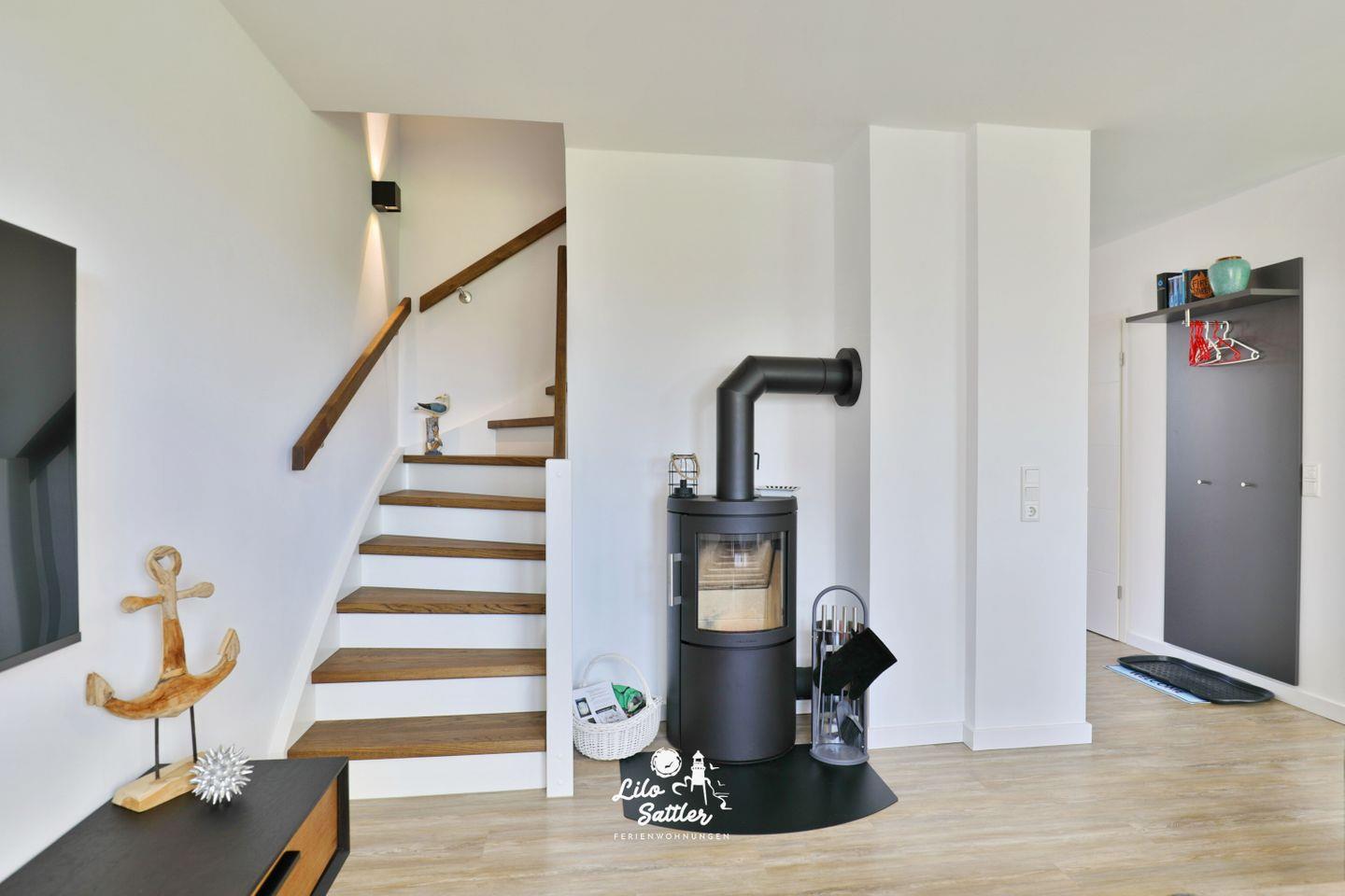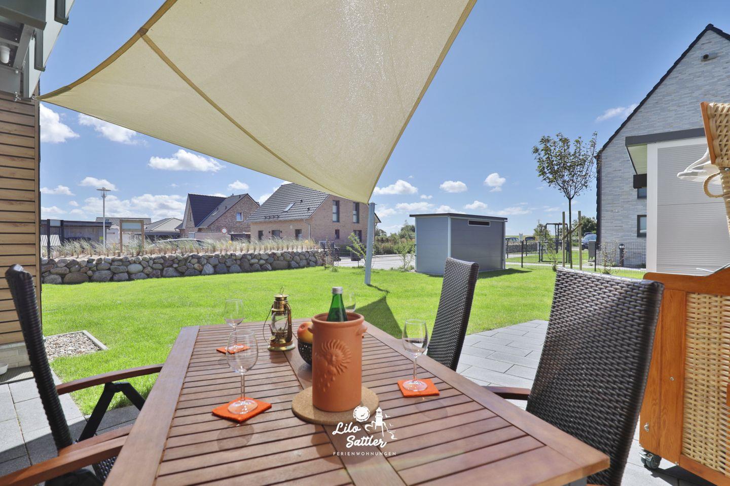 Der großzügige Wohn- und Essbereich mit Kaminofen bildet das Herzstück des Hauses und öffnet sich direkt zur sonnigen Terrasse. Hier können Sie geschützte Stunden unter dem Sonnensegel verbringen oder den Tag im Strandkorb bei frischer Nordseeluft ausklingen lassen. Der Garten bietet ausreichend Platz zum Entspannen und Wohlfühlen.
