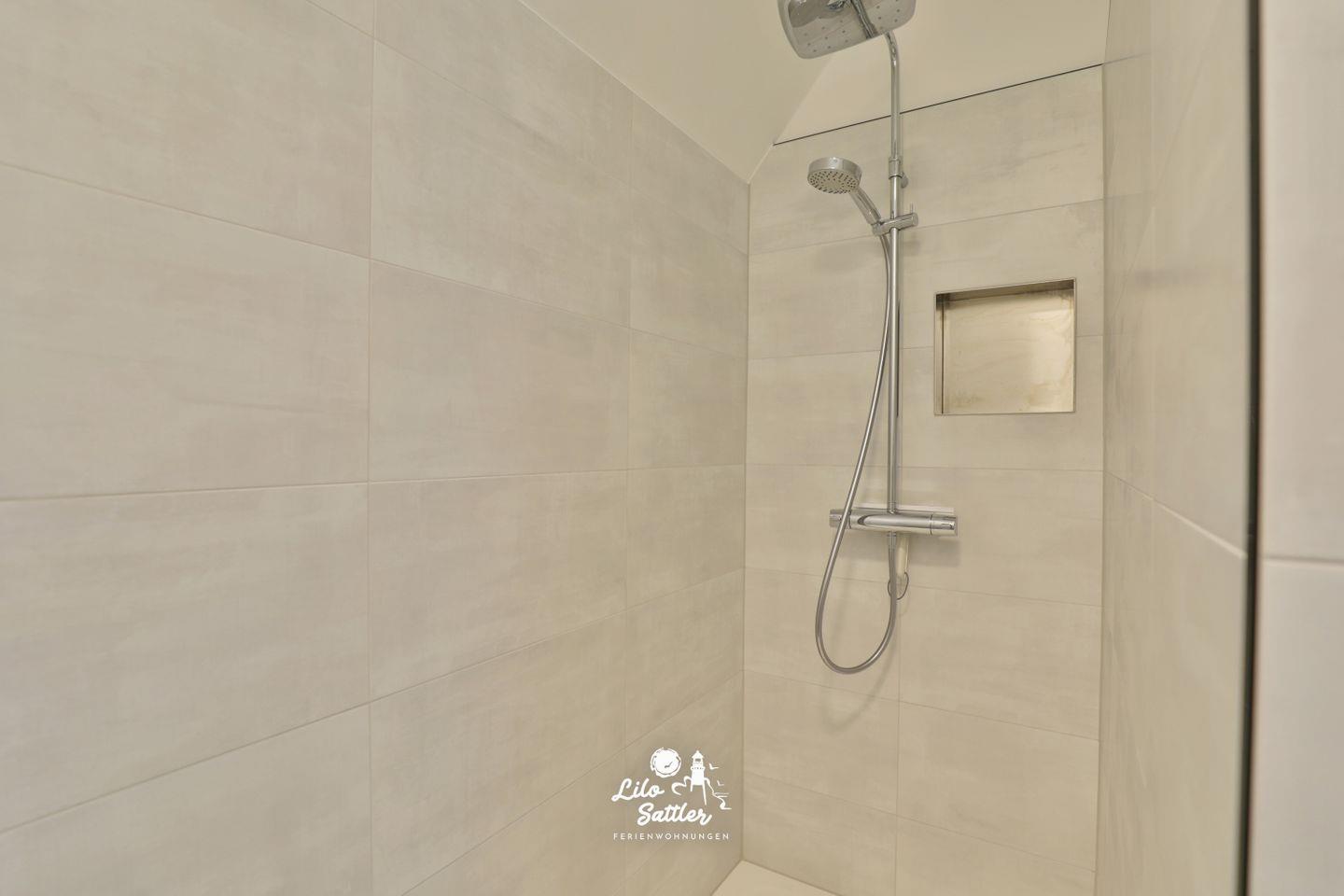 Bodentiefe Dusche, Infratorkabinen-Sauna für 2 Personen, großer Spiegel, zwei Waschbecken, separates WC, Fenster, Handtuchtrockner, blickdichte Fenster, Plissees, Waschmaschine, Trockner, Kommode
