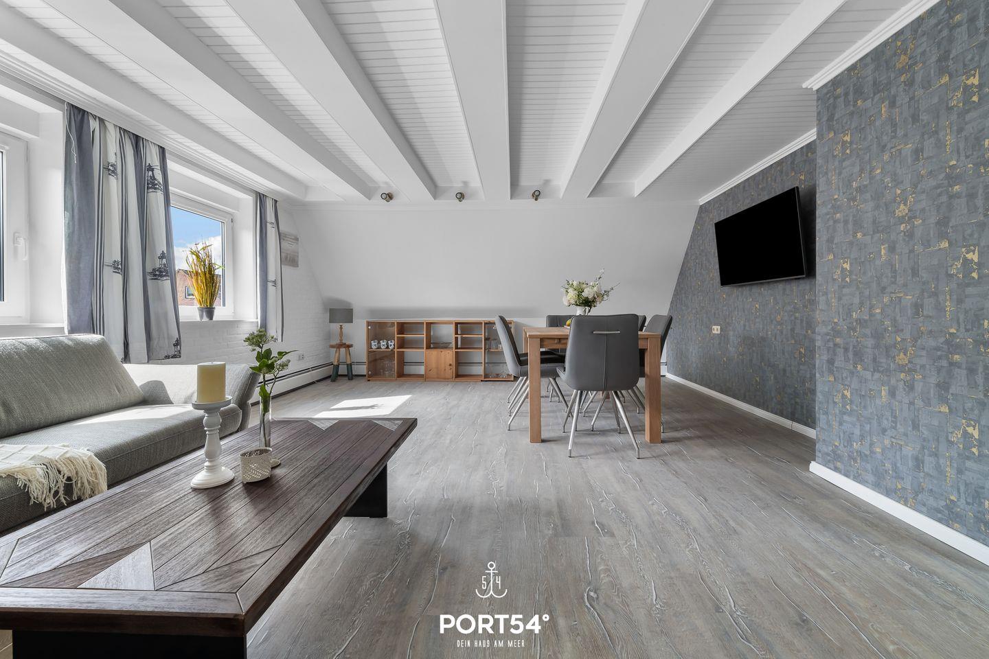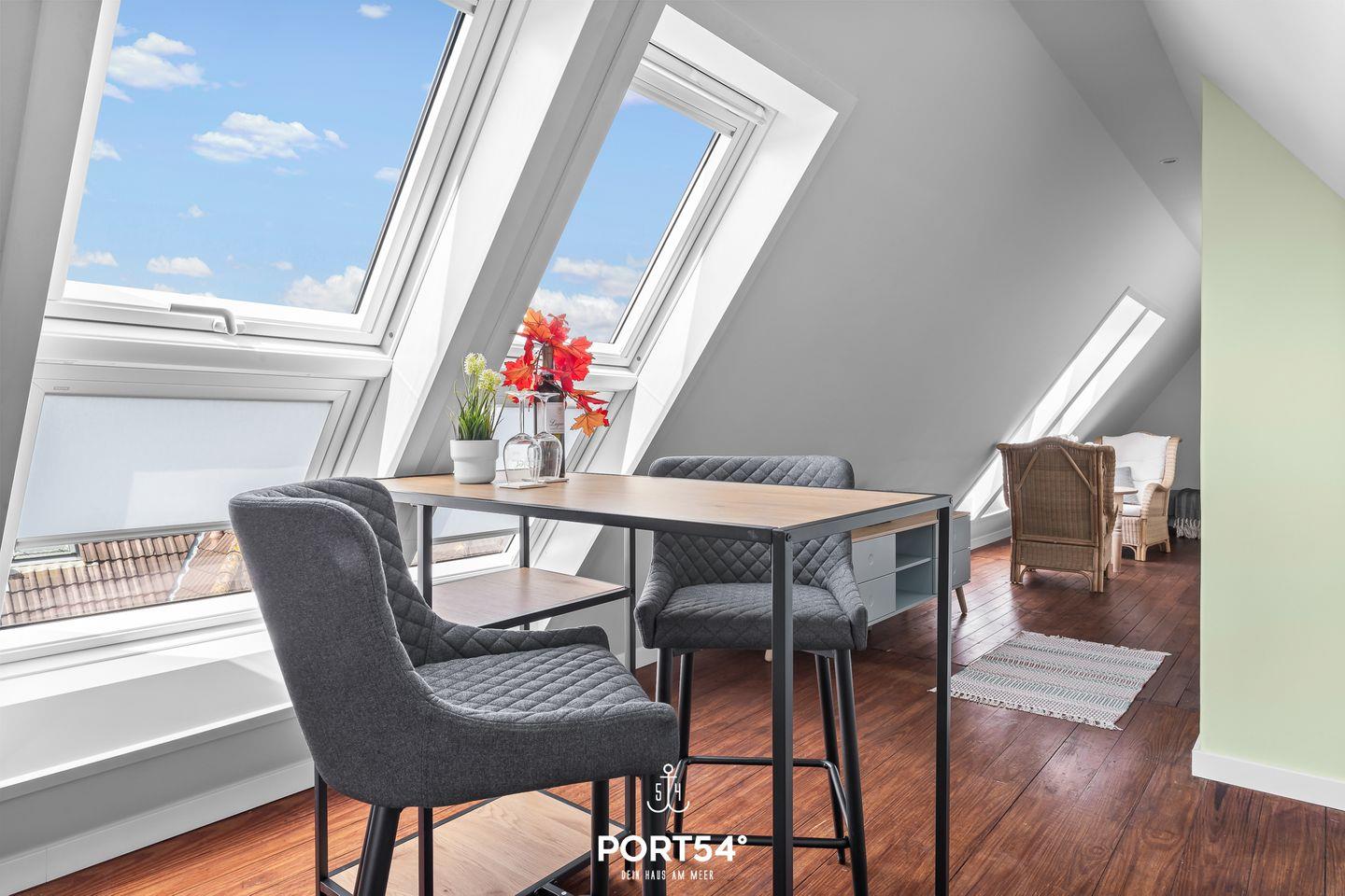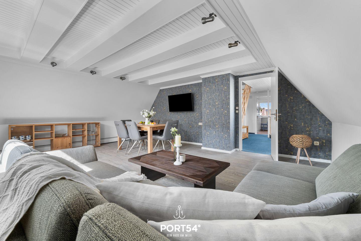 Die Strandnah gelegene Ferienwohnung bietet auf 82 m² einen offenen Wohn- und Essbereich mit Küche, zwei Schlafzimmer und ein Badezimmer. Eines der Schlafzimmer ist mit einem Doppelbett ausgestattet. Im Dachgeschoss stehen zwei einfache Einzelbetten zu Verfügung. Das Badezimmer verfügt über einen Föhn und eine Dusche. Ein Außenstellplatz am Haus ist vorhanden und Fahrräder können in einem gemeinschaftlichen Werkraum untergestellt werden.