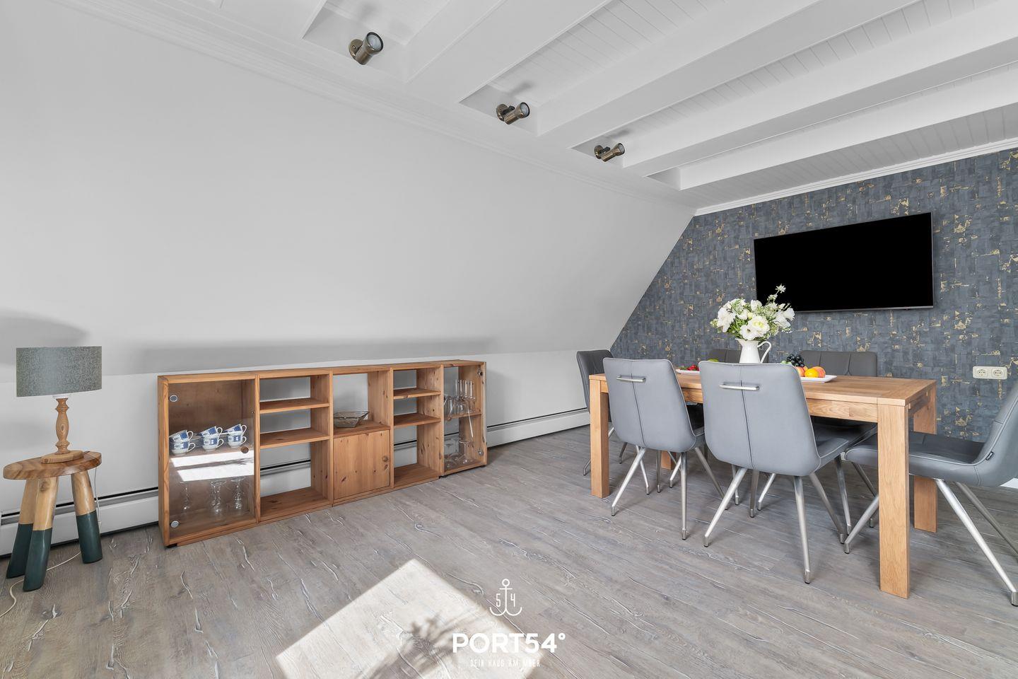Herzlich Willkommen im "Hausboot an der Lagune Oberdeck" in Büsum! Strandnah entspannen an der Nordsee! Die Ferienwohnung bietet auf 82 m² einen offenen Wohn- und Essbereich, eine Küche und zwei Schlafzimmer sowie ein Bad. Im Wohnzimmer kann man sich auf dem Sofa vor dem Flachbildfernseher entspannen. In der voll ausgestatteten Küche kann nach Lust und Laune gekocht werden. Ein Schlafzimmer verfügt über ein bequemes Doppelbett und Verdunklungsmöglichkeiten. Das zweite Schlafzimmer, das durch eine Treppe in das Dachgeschoss führt, verfügt über zwei weitere einfache Einzelbetten. Für unsere kleinen Gäste gibt es einen Kinderhochstuhl und ein Kinderreisebett.
