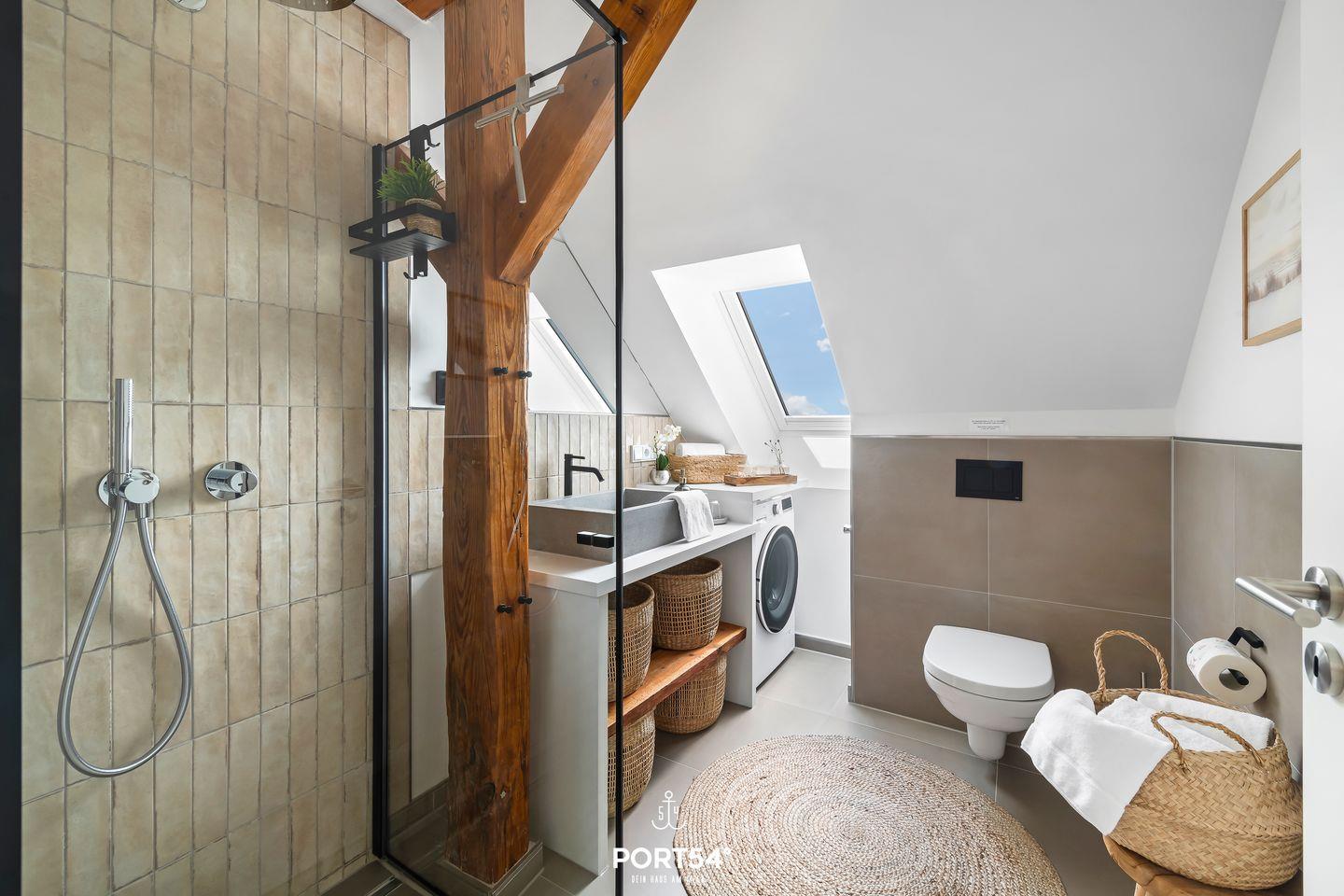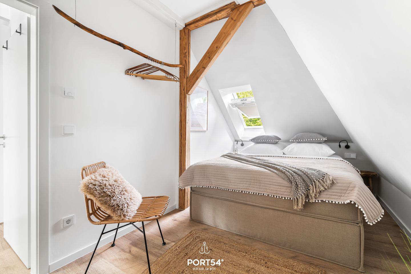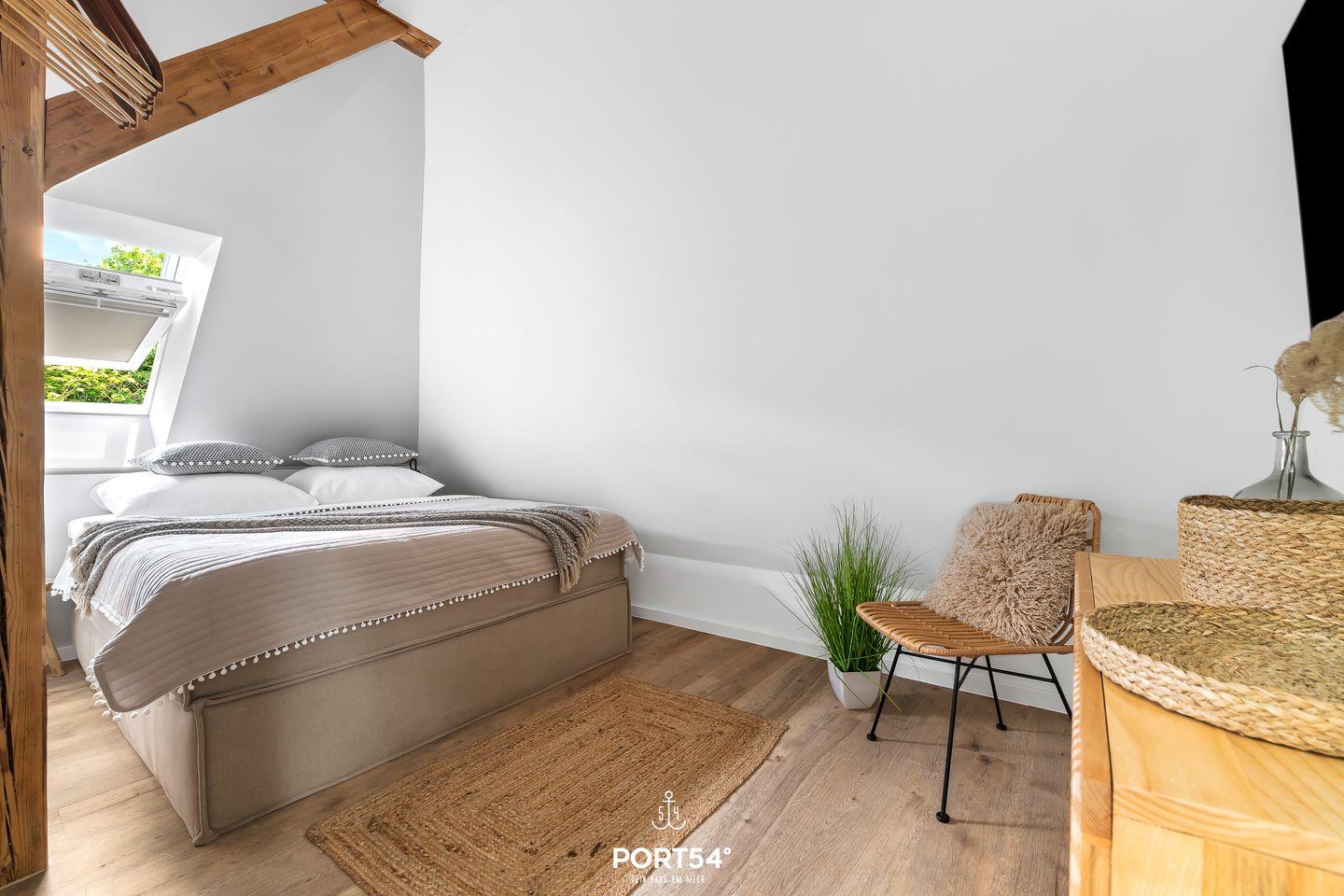 Die Wohnung bietet zwei komfortable Schlafzimmer mit hochwertigen Betten (160x200m und 180x200m), die für erholsamen Schlaf sorgen. Ideal für Familien: Ein Babybett und ein Hochstuhl stehen ebenfalls zur Verfügung, sodass auch die Kleinsten während des Urlaubs nicht zu kurz kommen. Das moderne Badezimmer verfügt über eine bodengleiche Dusche, einen Haartrockner und ausreichend Stauraum, sowie eine Waschmaschine– alles, was man für einen entspannten Aufenthalt benötigt.