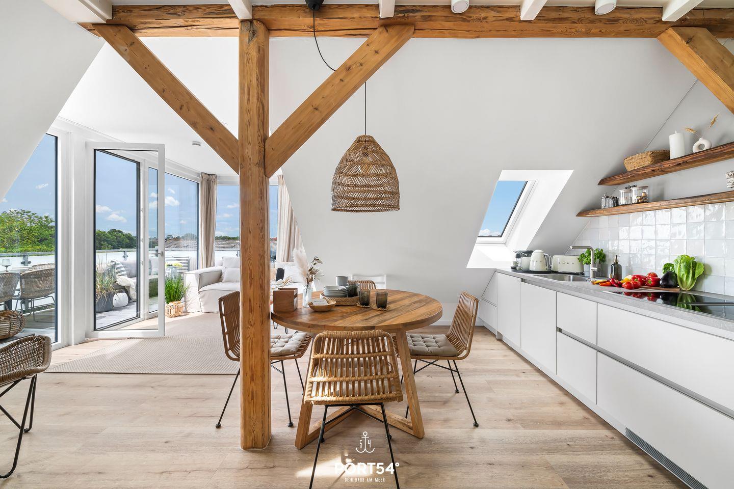 Die 55 m² große Wohnung ist ideal für bis zu vier Personen und bietet alles, was Sie für einen komfortablen Aufenthalt benötigen. Sie betreten die Ferienwohnung im zweiten Stock und finden einen hellen und einladenden Wohnraum vor, der mit einem gemütlichen Sofa und einem Esstisch ausgestattet ist – der perfekte Platz für gesellige Abendessen oder entspannte Spieleabende. Die Glasfront zum Balkon ist mit Wärmeschutzvorhängen ausgestattet, das für ein kühles Raumklima sorgt. Das Wohnzimmer und beide Schlafzimmer verfügen über einen Insektenschutz. Für heiße Tage steht ein moderner Ventilator zur Verfügung. Die offene Küche ist komplett ausgestattet mit modernen Geräten, darunter eine Nespresso-Maschine, ein Induktionsherd, eine Spülmaschine und sogar eine Küchenmaschine. Hier können Sie kulinarische Köstlichkeiten zaubern oder sich einfach nur eine Tasse Kaffee gönnen, während Sie den Blick auf die Umgebung genießen.