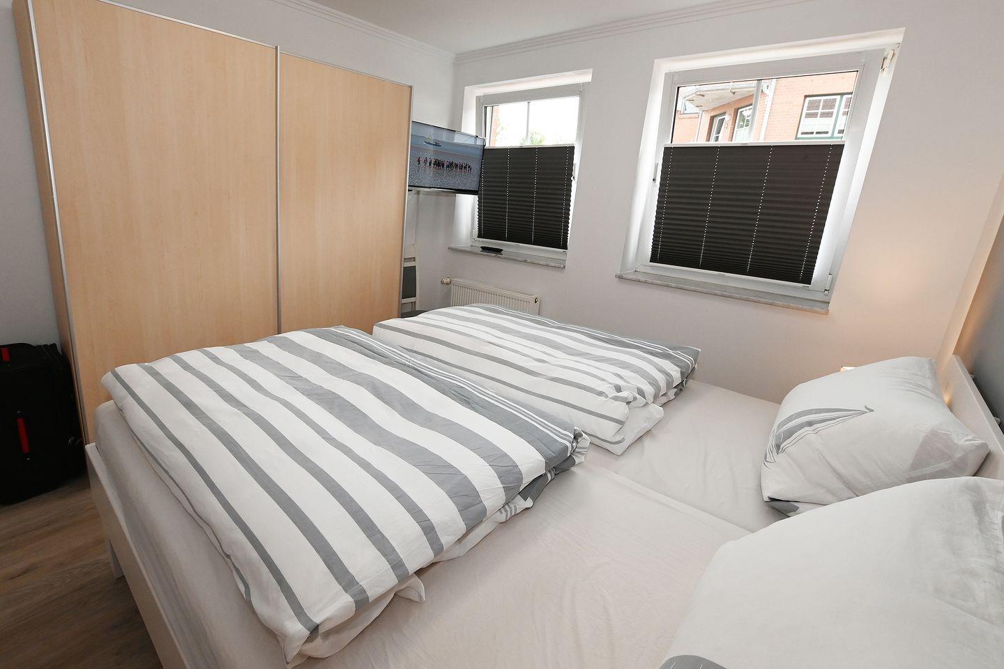 Die Wohnung verfügt über 1 Schlafzimmer, dass mit einem 1,80 x 2,00 Meter Bett ausgestattet ist. Das Sofa kann ausgeklappt werden und bietet eine Schlaffläche von 1,40 x 2,00 Meter für eine weitere Person.