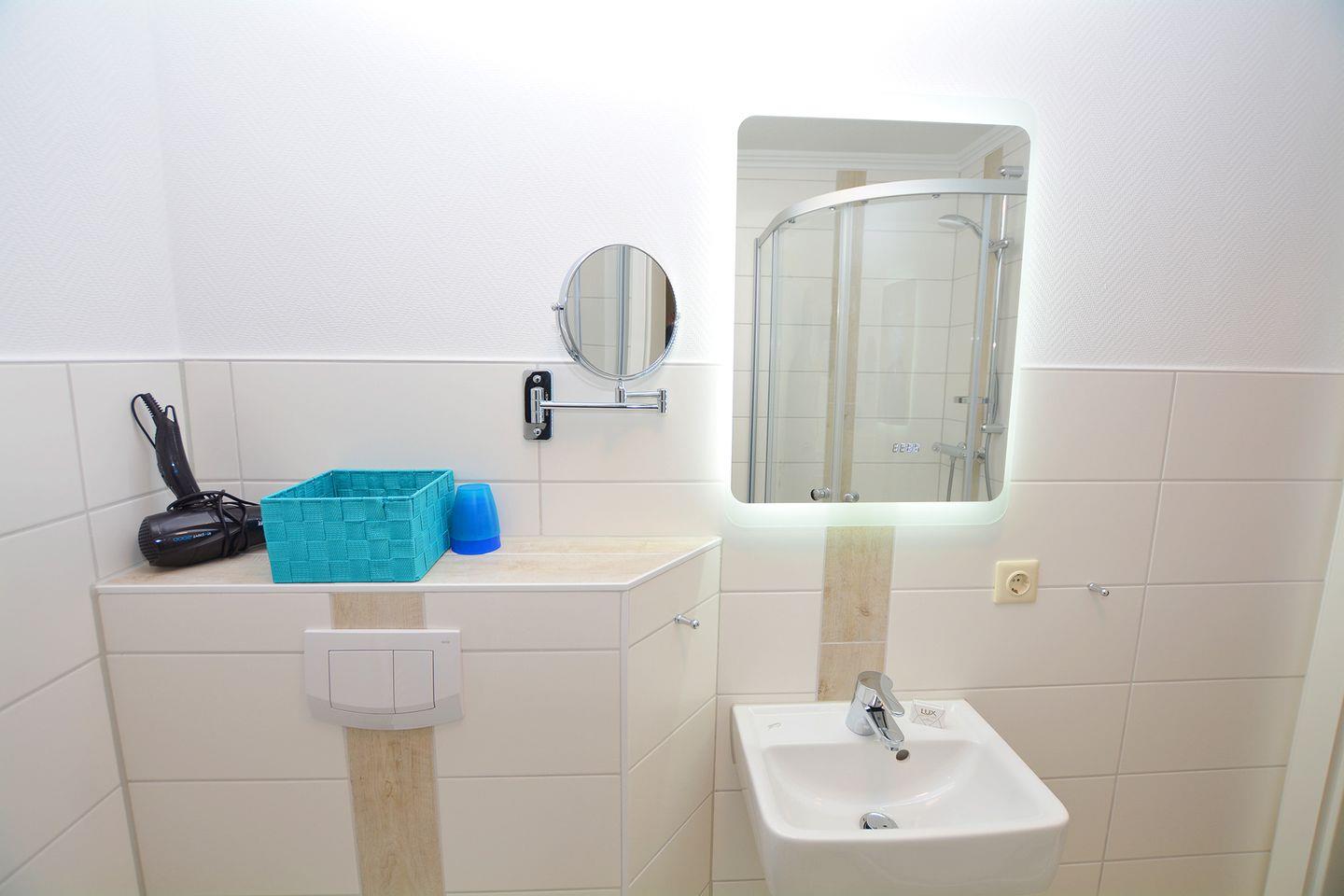 Das Badezimmer verfügt über eine bodengleiche Dusche, sowie ein Fenster und einen Haartrockner.
