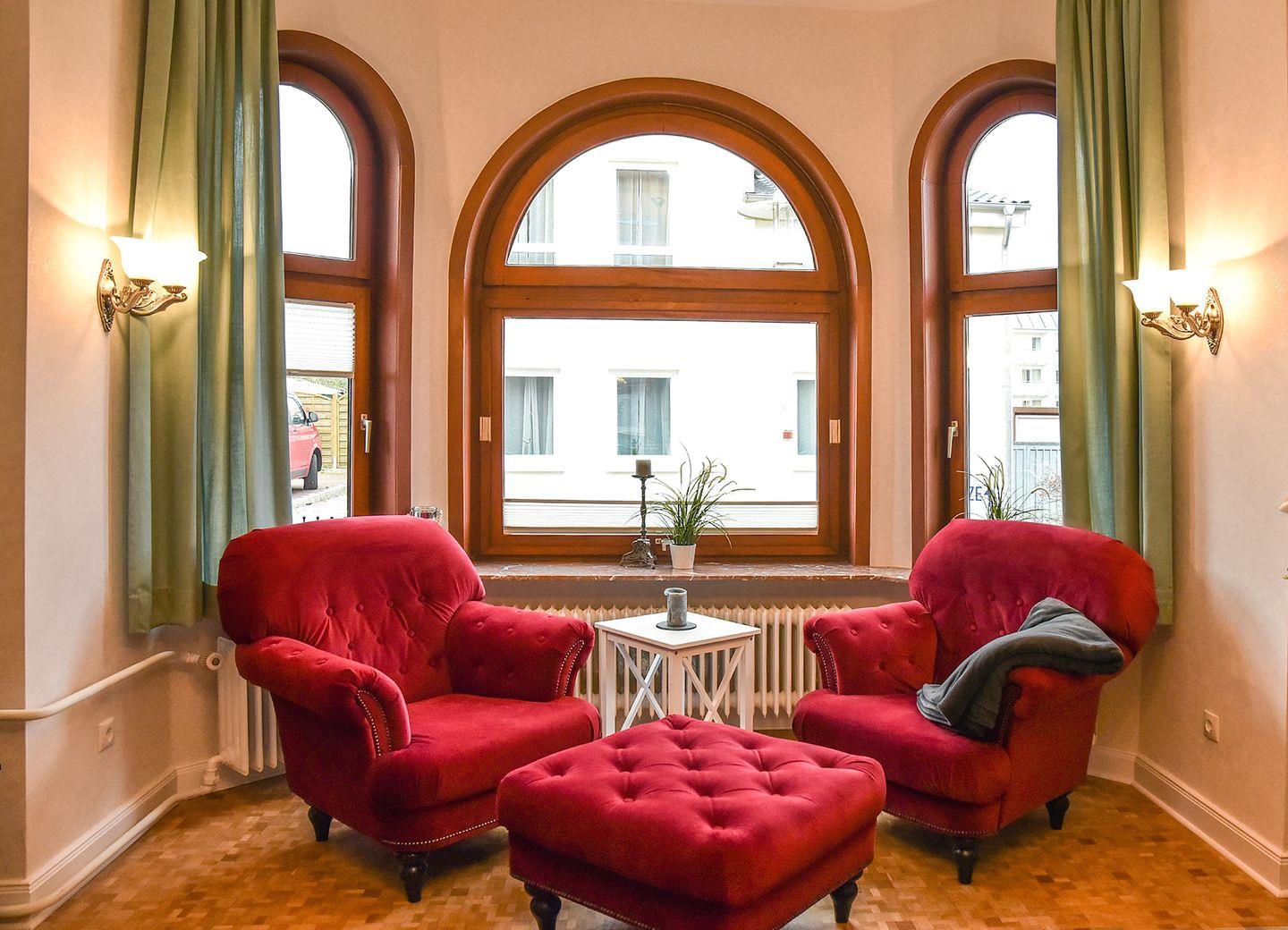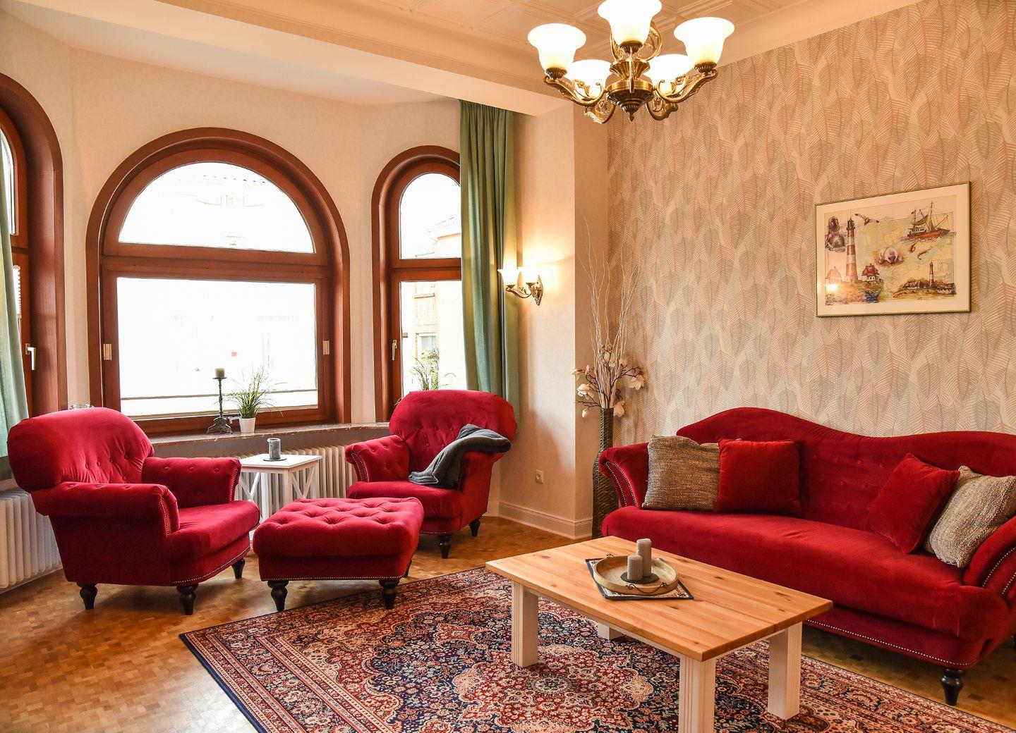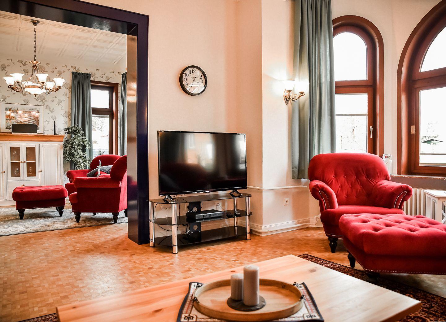 Willkommen in der bezaubernden "Villa Heimfried" – einem Ferienhaus, das Komfort und Eleganz inmitten einer idyllischen Umgebung vereint. Das Erdgeschoss dieses charmanten Rückzugsortes bietet eine Fülle an Annehmlichkeiten, um Ihren Aufenthalt unvergesslich zu machen. Im großzügigen Wohnzimmer erwartet Sie ein riesiges und gemütliches Sofa, begleitet von einem Hocker und einem stilvollen Couchtisch. In einem Erkerbereich laden zwei bequeme Sessel dazu ein, entspannte Momente zu genießen. Ein hochauflösender 120cm Internet-TV mit Kabelanschluss und Festplattenrecorder sorgt für Unterhaltung auf höchstem Niveau.