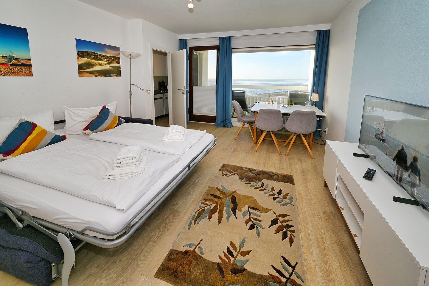 Sie schlafen auf dem gemütlichen Schlafsofa im Wohnzimmer. Von hier können Sie den Blick auf die Nordsee genießen.