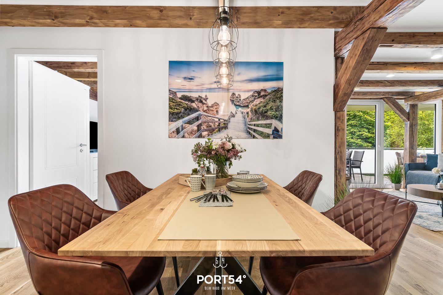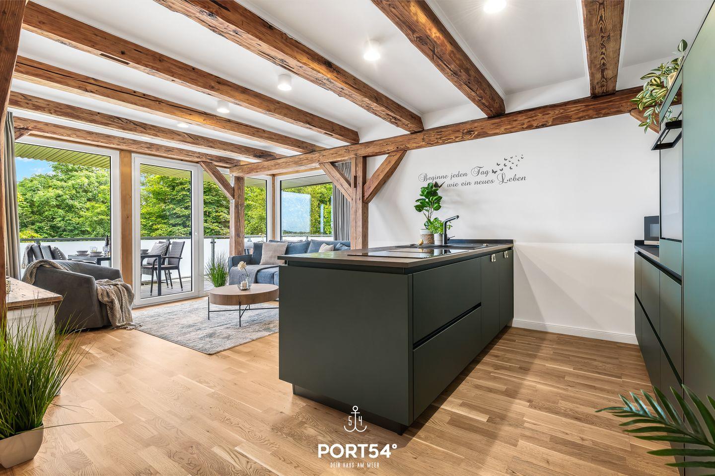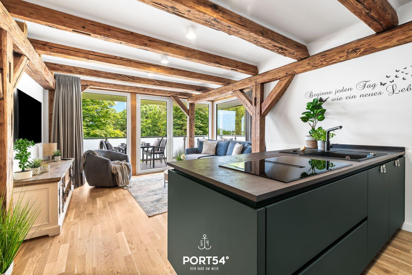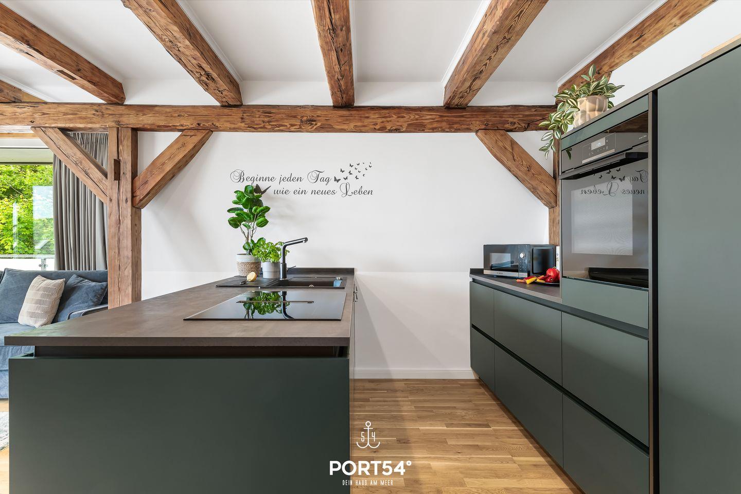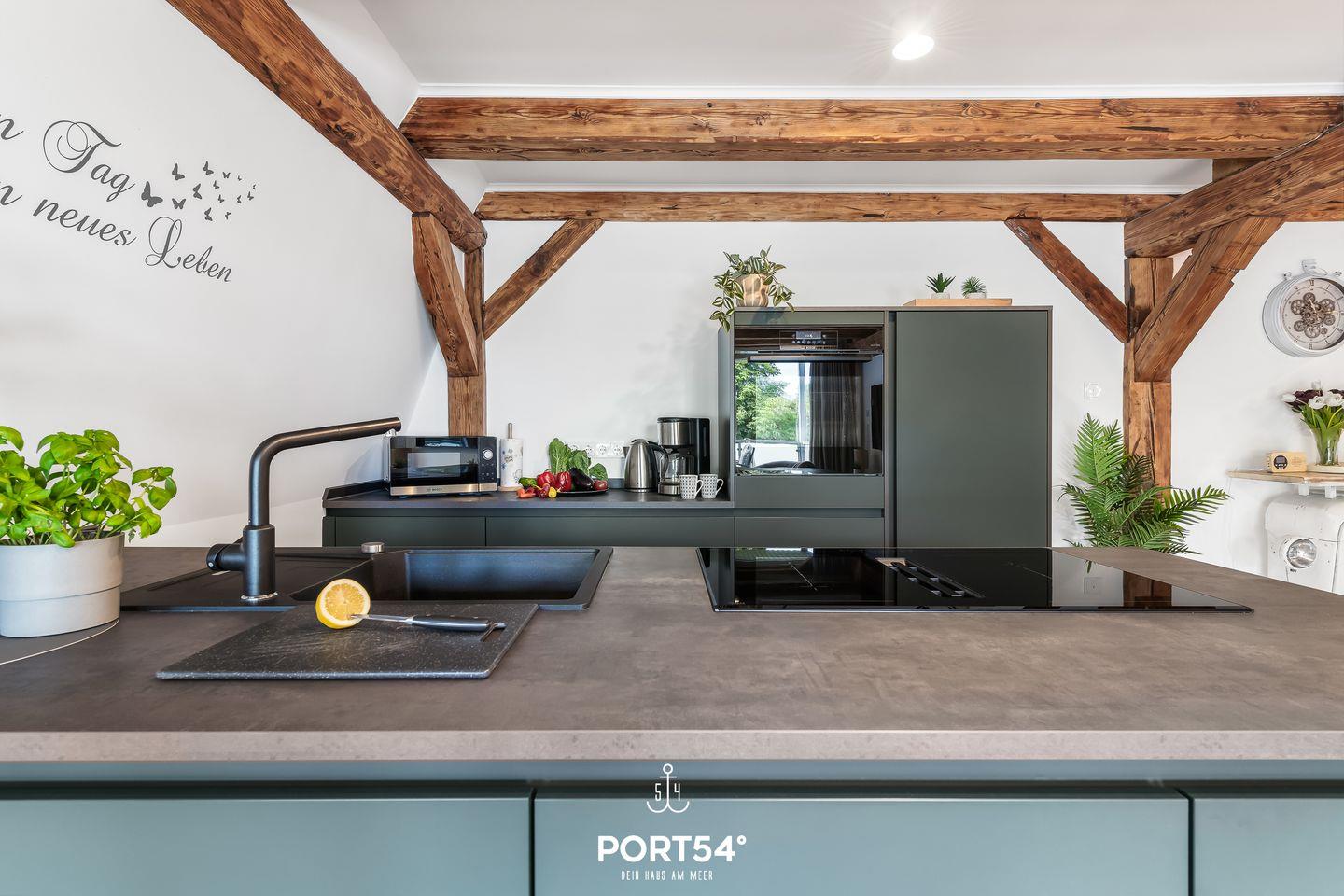 Die Wohnung ist liebevoll eingerichtet und verfügt über eine offene Küche, die mit hochwertigen Geräten ausgestattet ist. Hier können Sie gemeinsam kochen und Ihre kulinarischen Köstlichkeiten zubereiten, während der Essbereich für gesellige Abende einlädt. Genießen Sie die Zeit auch auf dem großen Balkon wo Sie die frische Meeresluft und die ländliche Idylle genießen können.
