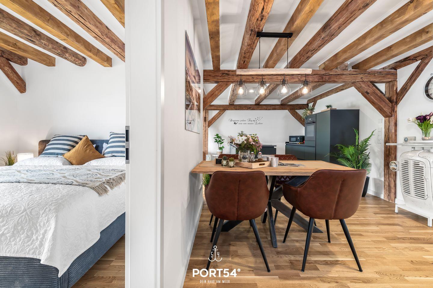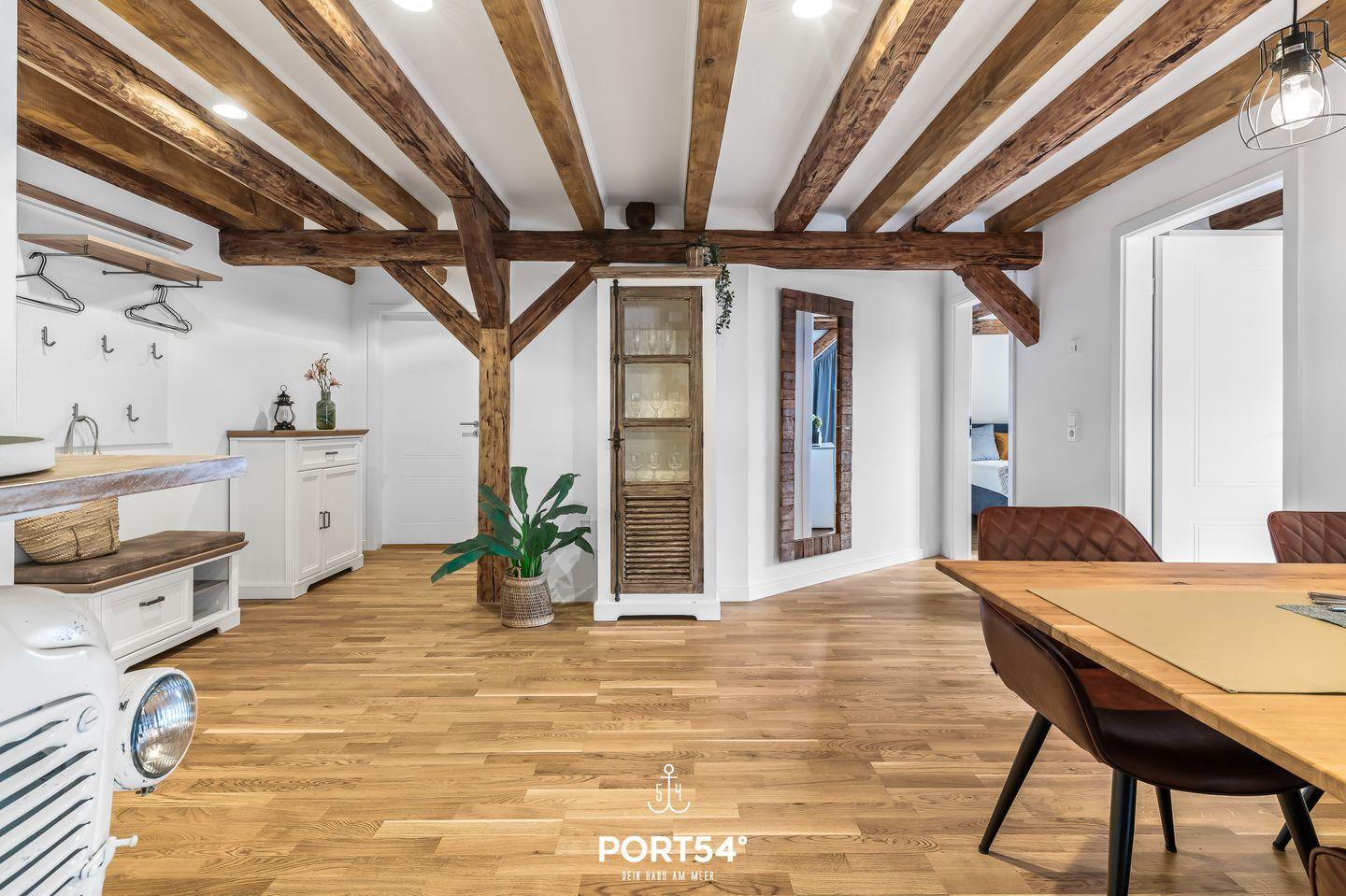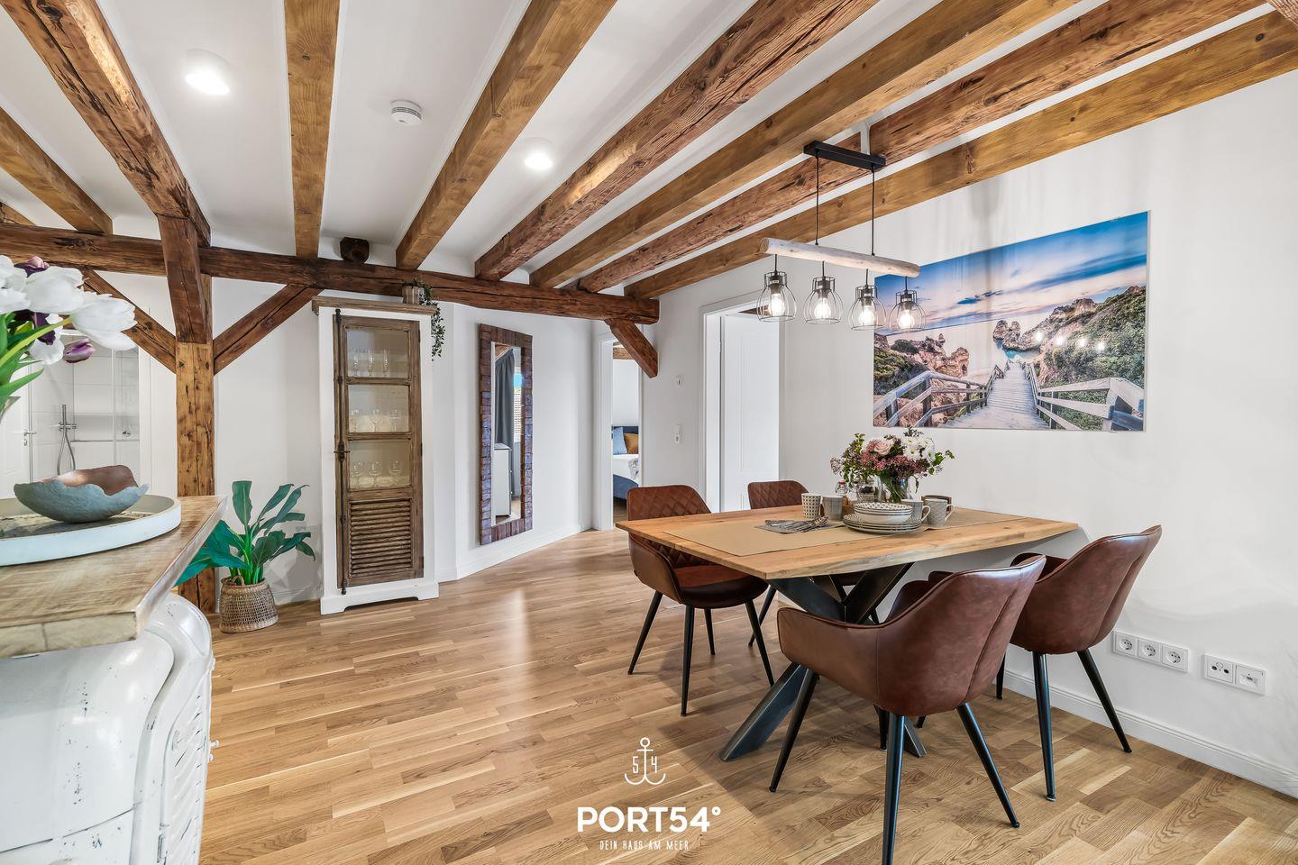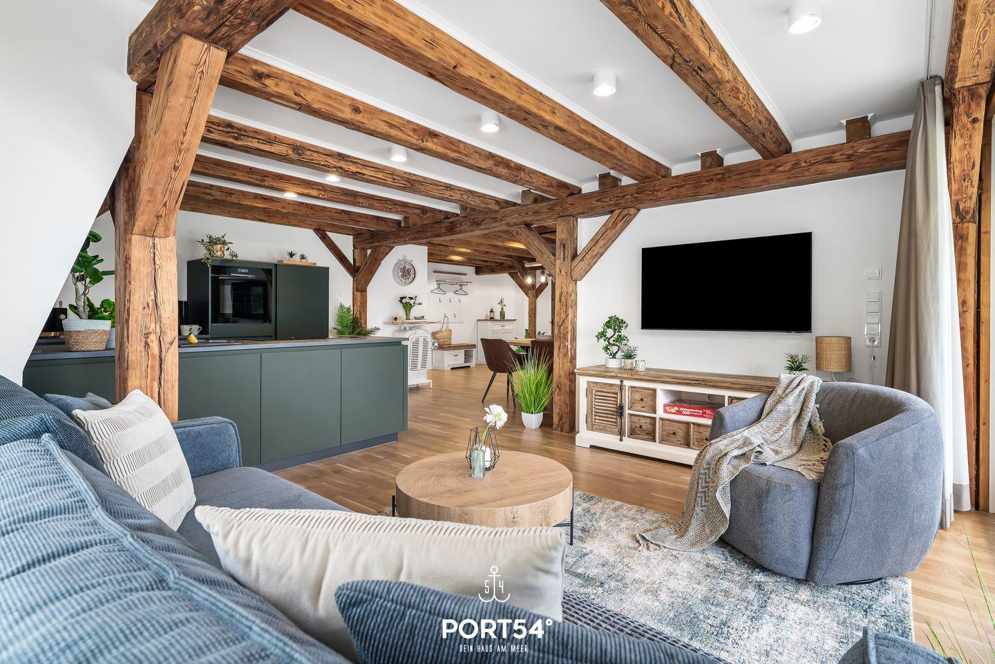 Die Wohnung ist liebevoll eingerichtet und verfügt über eine offene Küche, die mit hochwertigen Geräten ausgestattet ist. Hier können Sie gemeinsam kochen und Ihre kulinarischen Köstlichkeiten zubereiten, während der Essbereich für gesellige Abende einlädt. Genießen Sie die Zeit auch auf dem großen Balkon wo Sie die frische Meeresluft und die ländliche Idylle genießen können.