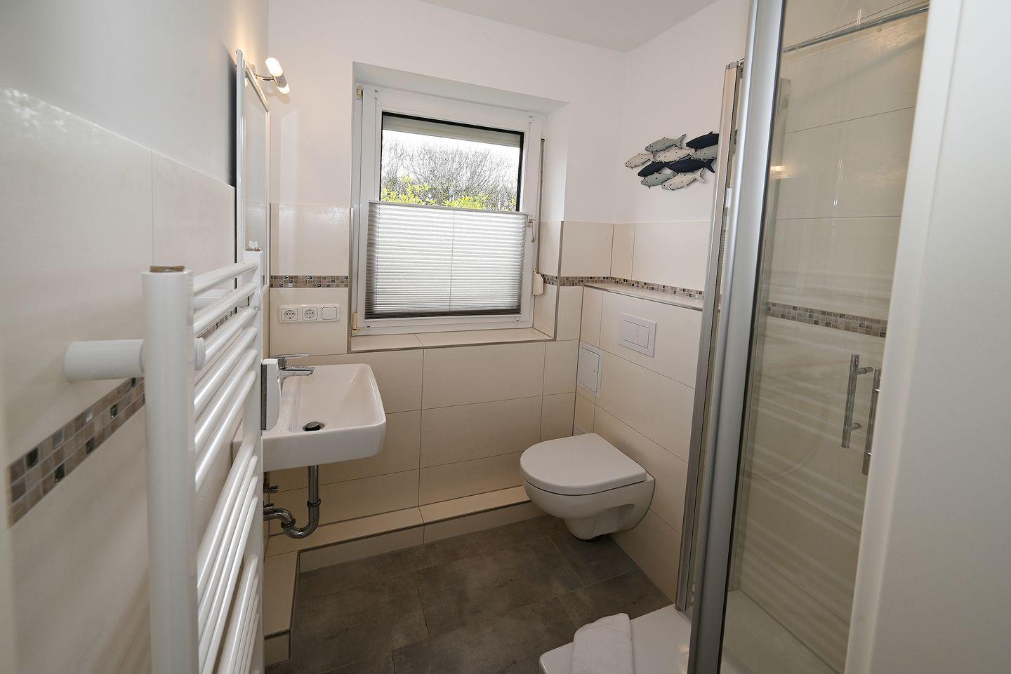 Ebenso bietet das Bad eine Handtuchheizung und ist mit einem Fenster versehen.