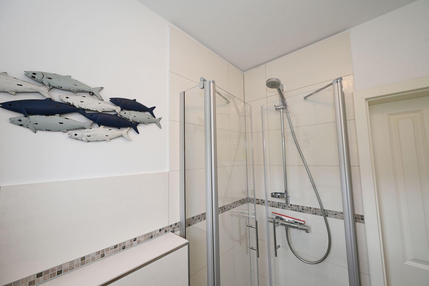 Das moderne Badezimmer ist mit einer Dusche ausgestattet, die einen kleinen Einstieg hat.