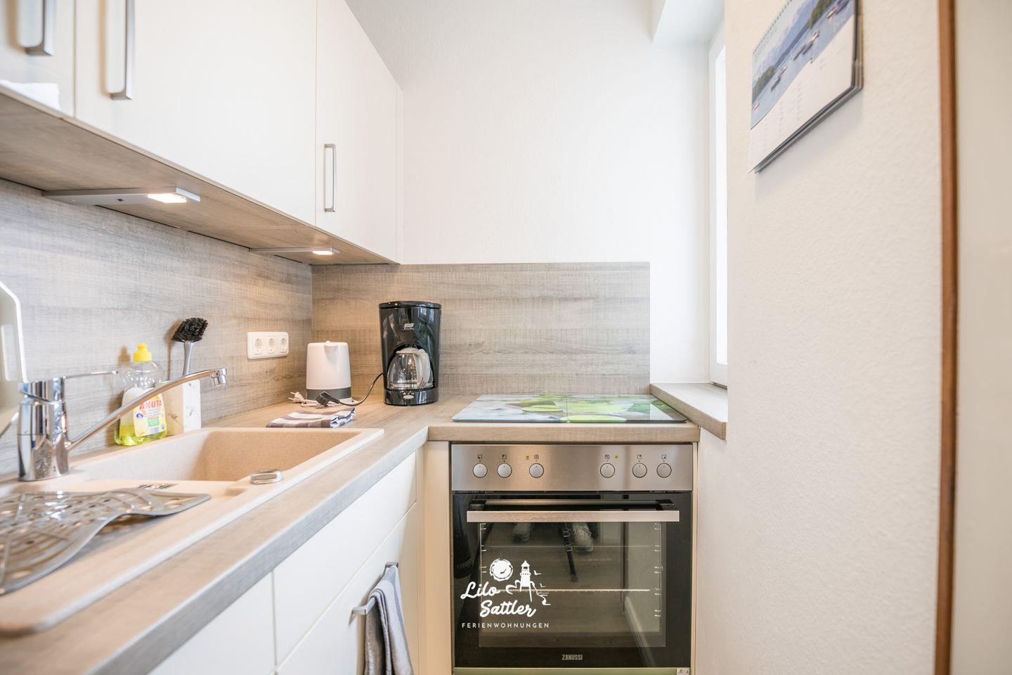 Herd, Backofen, Kühlschrank mit Gefrierfach, Kaffeemaschine, Toaster, Wasserkocher, Eierkocher, Fenster