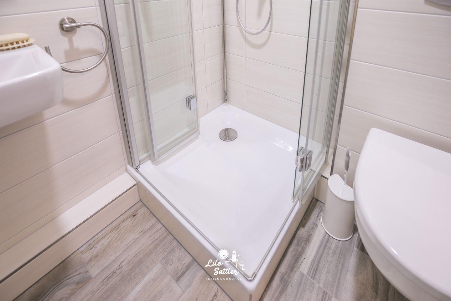 Dusche (ca. 20cm Einstiegshöhe), WC, Spiegel, Waschbecken, Fön, Handtuchtrockner