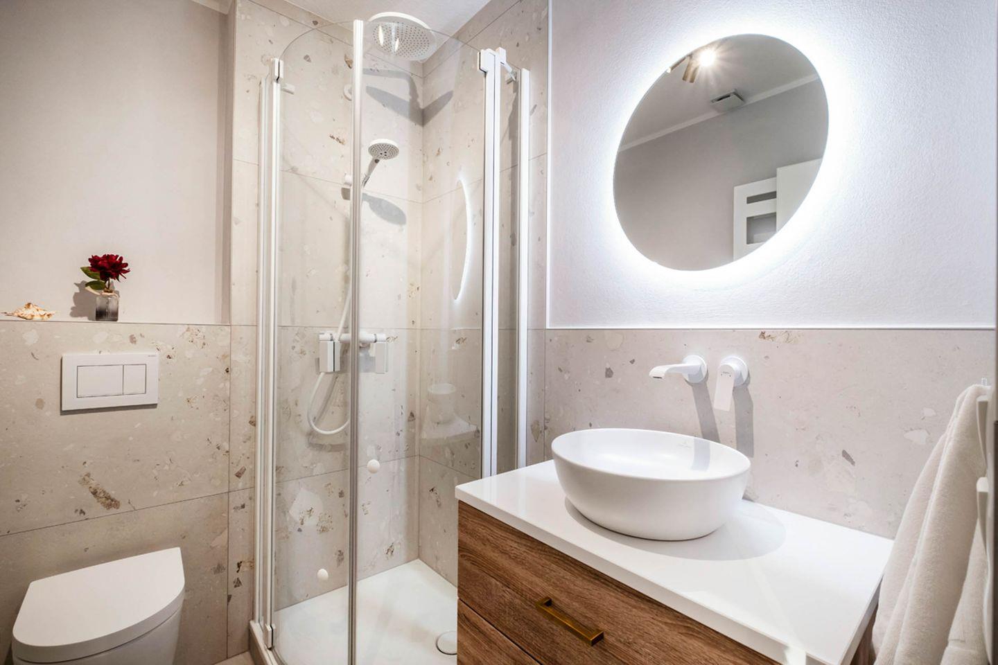 Das Badezimmer ist mit Dusche und WC ausgestattet. Vom Wohnbereich aus gelangen Sie direkt auf den Balkon in sonniger Süd-West-Lage – ideal, um entspannte Stunden zu genießen. Im Schlafzimmer erwartet Sie ein bequemes Doppelbett (180cm x 200cm).