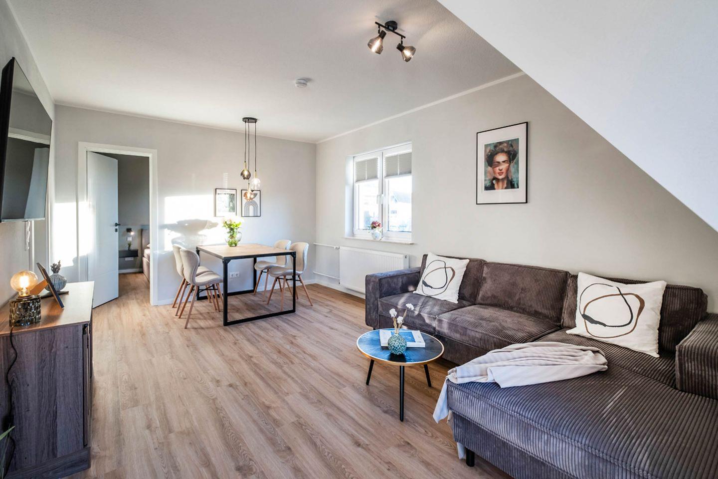 Freuen Sie sich auf eine gemütliche Ferienwohnung mit einem Wohnzimmer inklusive Essbereich und komfortabler Schlafcouch, einer kleinen Küchenzeile, einem separaten Schlafzimmer sowie einem Duschbad.