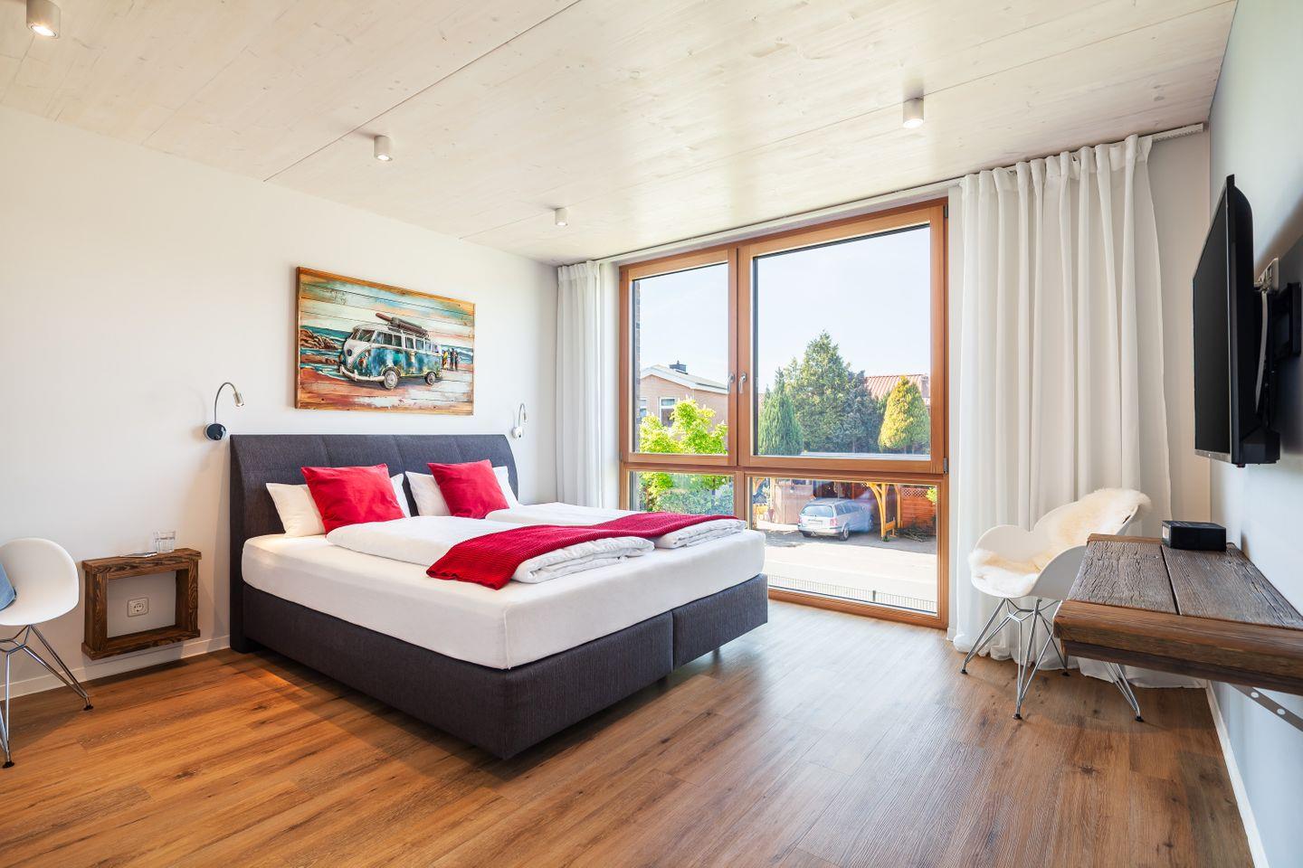 Boxspringdoppelbett mit durchgehender Matratze (180x200cm), Nachttische + Lampen, Kleiderschrank, Flachbild-TV, Fliegengitter