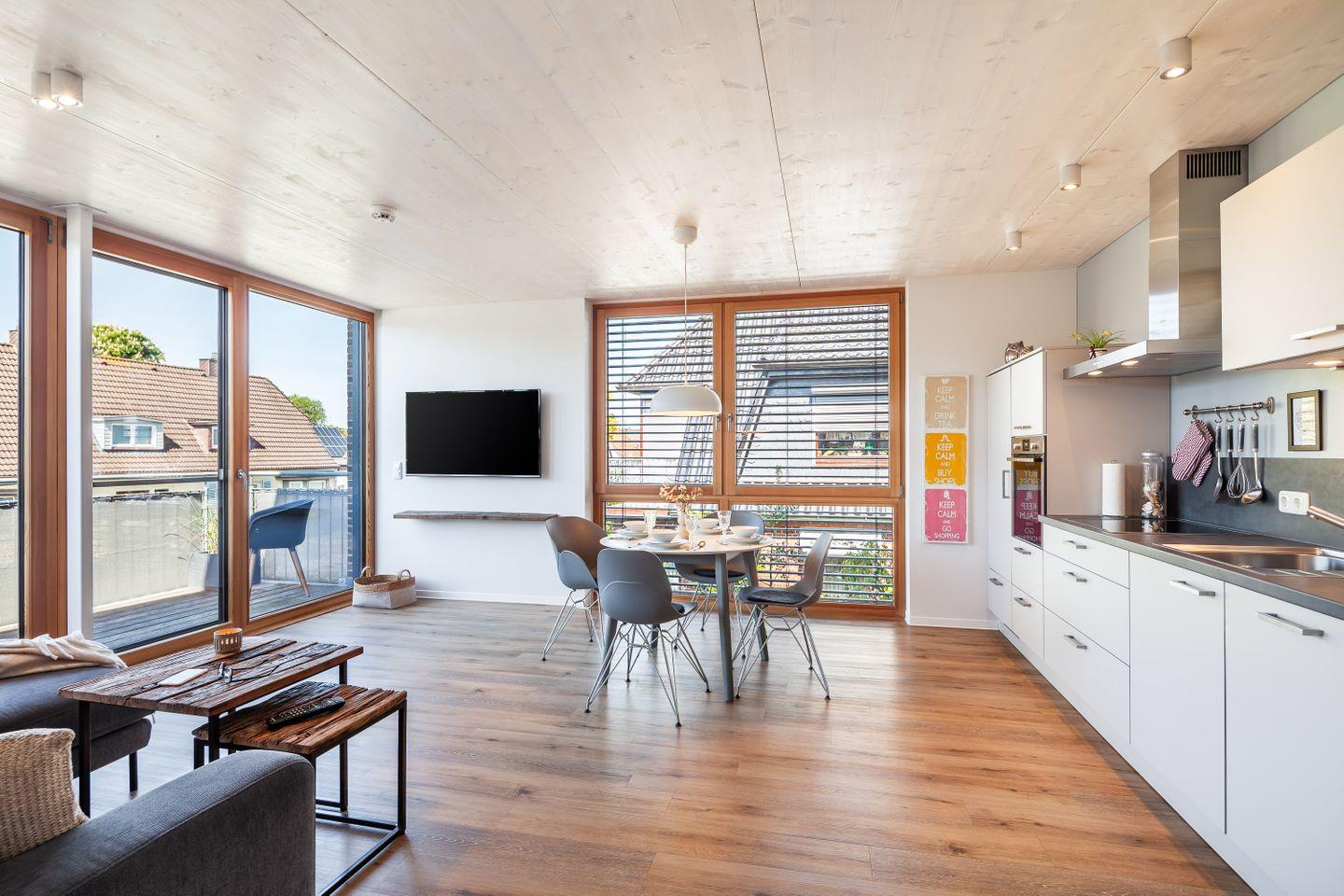 Im Architektenhaus Best Büsum wohnen Sie in der Wohnung Flut komfortabel mit viel Platz – nah am Binnen-Deich, zentral und nur wenige Minuten zu Hafen, Bahnhof, Einkauf und Stadtzentrum.
