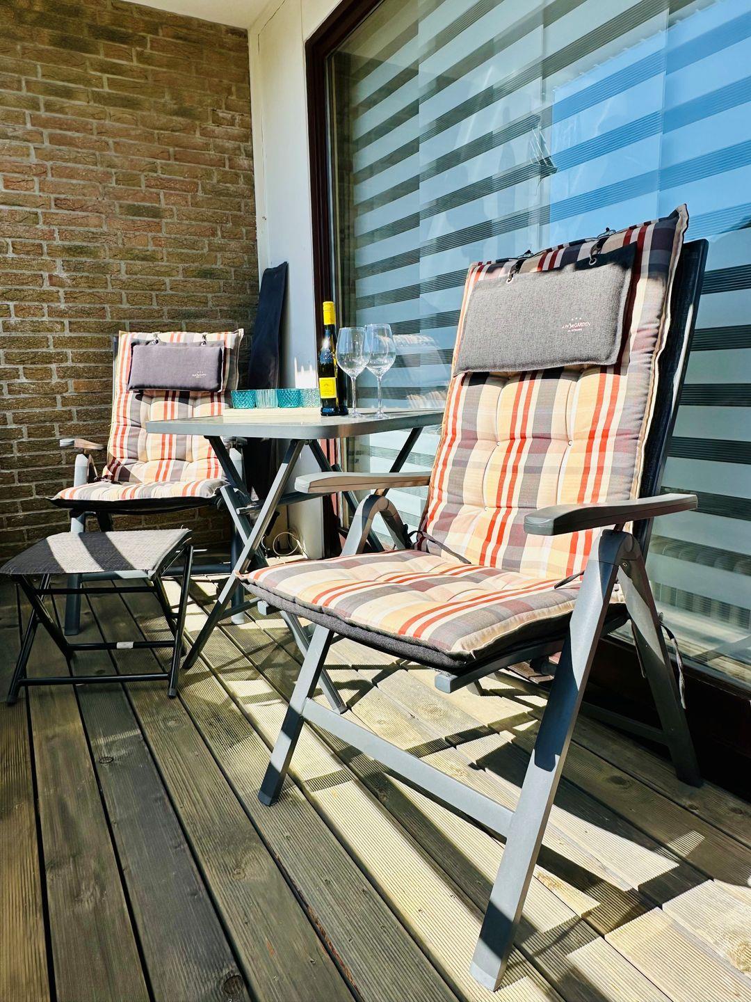 Vom Wohnraum betritt man den möblierten Balkon, auf dem man die gute Luft der nahen Nordsee genießen kann.