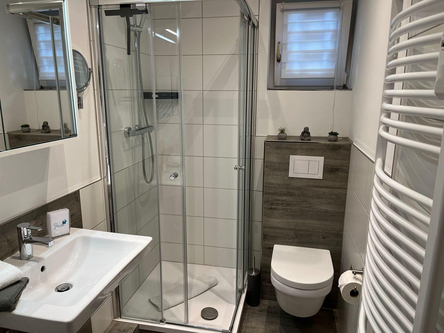 Ein kleines, aber hochwertiges Tageslichtbad mit Dusche und Handtuchwärmer komplettiert diese schöne Wohnung.