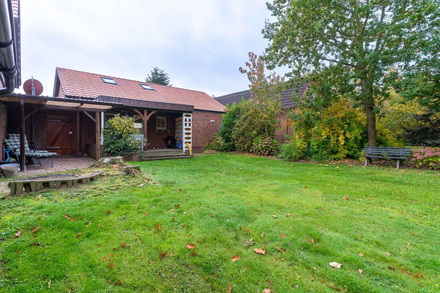 Der große Garten ist ein wahres Highlight des Hauses. Auf zwei Terrassen erwarten Sie Gartenstühle, Tische und zwei gemütliche Gartenliegen – perfekt, um die frische Nordseeluft zu genießen oder gesellige Grillabende zu verbringen.