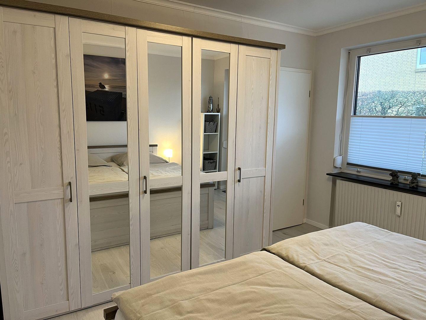 Das Schlafzimmer ist mit einem Doppelbett (1,80x 2m, 2 Einzelmatratzen) und einem Kleiderschrank für Ihre Urlaubsgarderobe möbliert. Wie in der ganzen Wohnung gibt es auch hier Außenjalousien, so dass nichts Ihren erholsamen Schlaf stört.