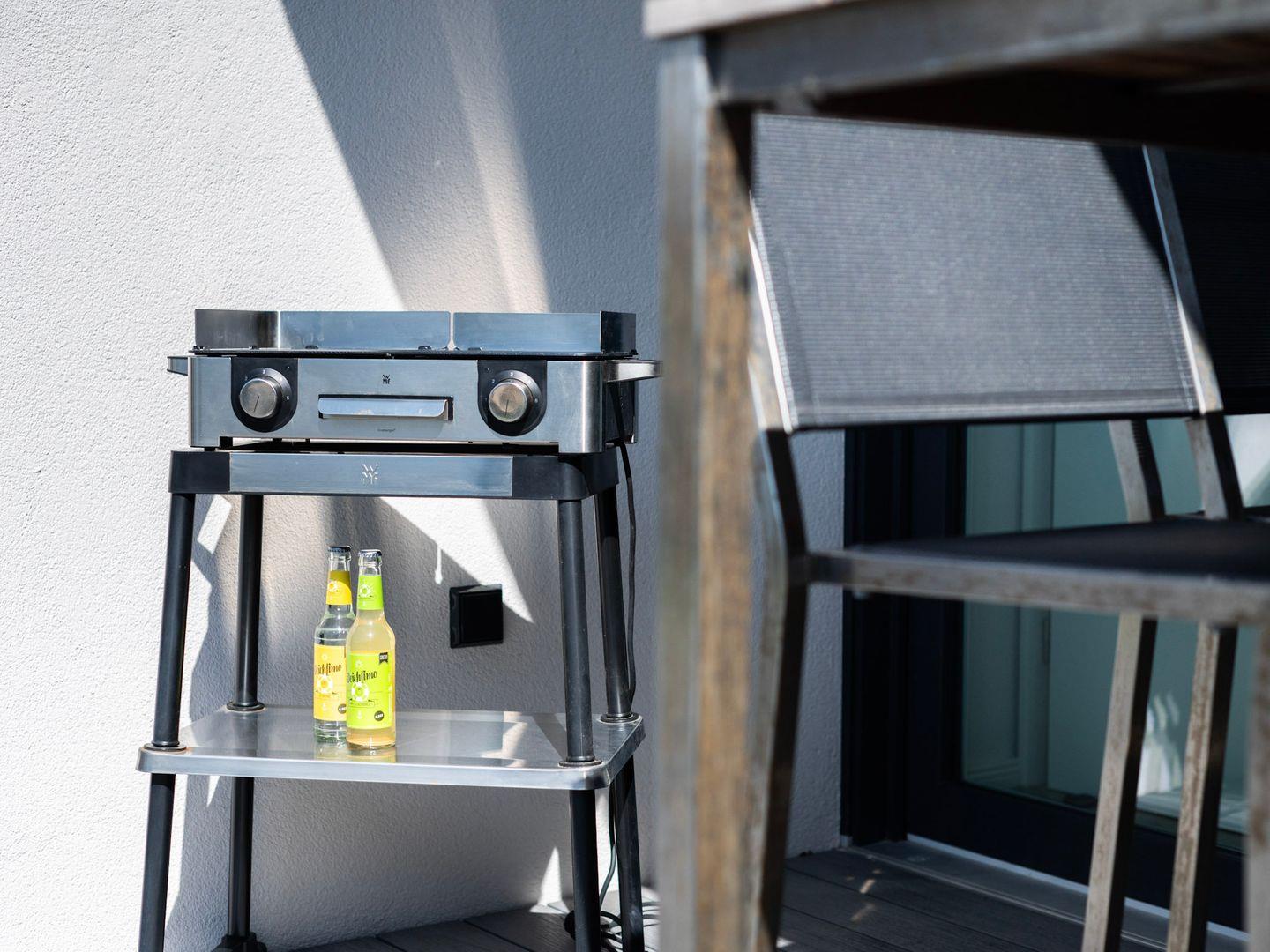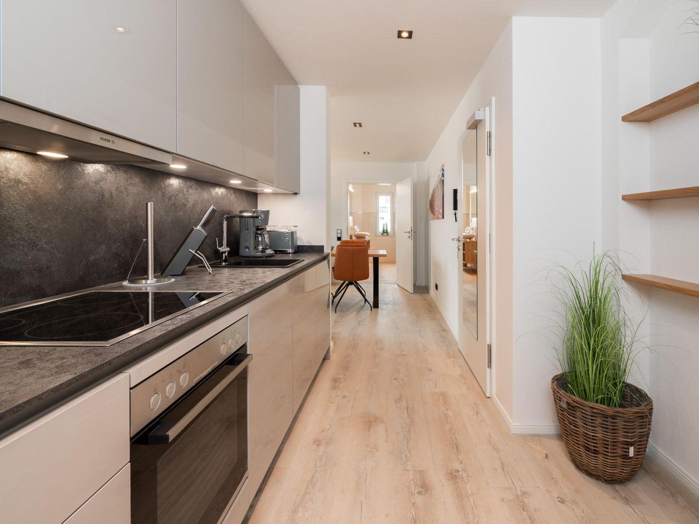 Die vollständig ausgestattete Küche lässt keine Wünsche offen. Kochen Sie Ihre Lieblingsgerichte auf dem modernen Ceran-Herd oder lassen Sie den Tag mit einem frisch gebrühten Kaffee aus der Nespresso-Maschine ausklingen. Zur Ausstattung gehören zudem eine Spülmaschine, ein Kühlschrank mit Gefrierfach sowie alle nötigen Küchenutensilien, damit Sie auch im Urlaub nicht auf den gewohnten Komfort verzichten müssen.